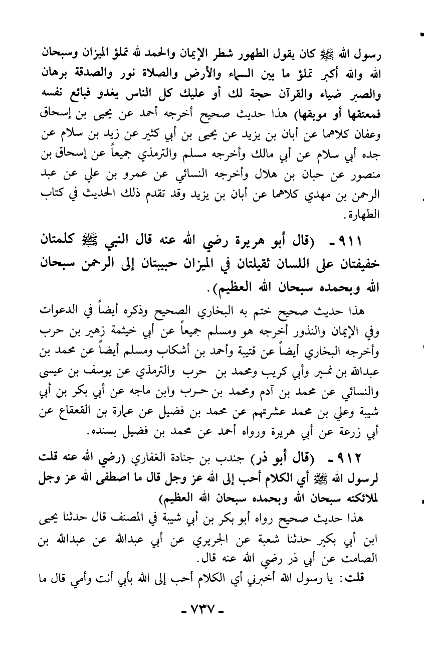 911 - (قال أبو هريرة رضي الله عنه قال النبي - صلّى الله عليه وسلم - كلمتان خفيفتان على اللسان ثقيلتان في الميزان حبيبتان إلى الرحمن سبحان الله وبحمده سبحان الله العظيم).