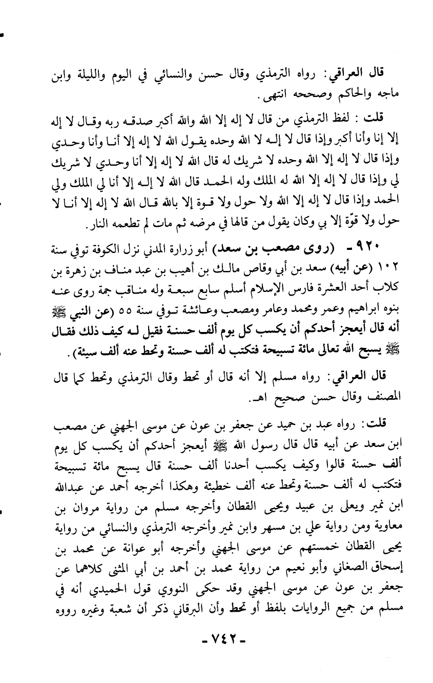 920 - (روى مصعب بن سعد) أبو زرارة المدني نزل الكوفة توفي سنة 102 (عن أبيه) سعد بن أبي وقاص مالك بن أهيب بن عبد مناف بن زهرة بن كلاب أحد العشرة فارس الإسلام أسلم سابع سبعة وله مناقب جمة روى عنه بنوه إبراهيم وعمر ومحمد وعامر ومصعب وعائشة توفي سنة 55 (عن النبي - صلّى الله عليه وسلم- أنه قال أيعجز أحدكم أن يكسب كل يوم ألف حسنة فقيل له كيف ذلك فقال - صلّى الله عليه وسلم - يسبح الله تعالى مائة تسبيحة فتكتب له ألف حسنة وتحط عنه ألف سيئة).