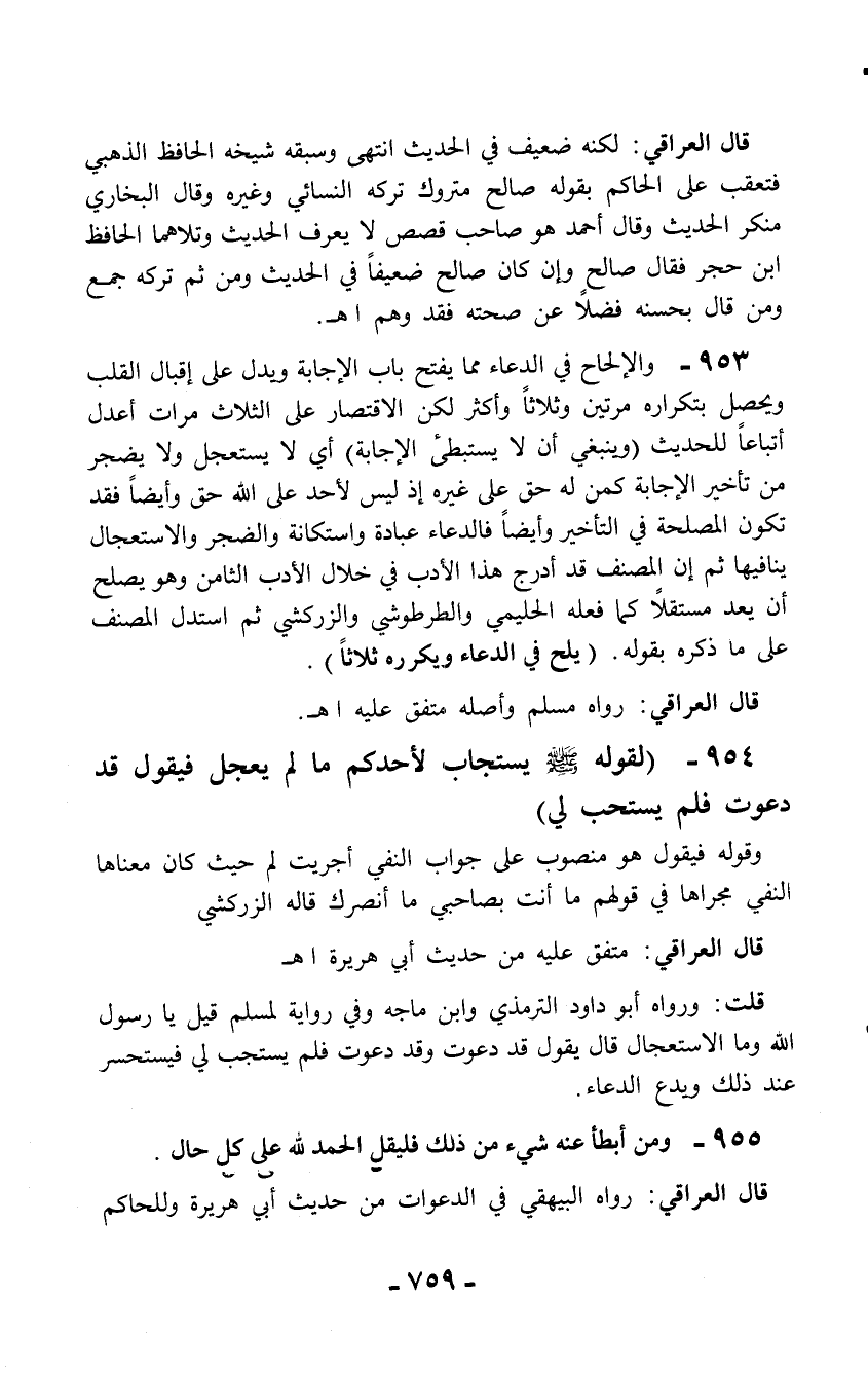 954 - (لقوله - صلّى الله عليه وسلم - يستجاب لأحدكم ما لم يعجل فيقول قد دعوت فلم يستحب لي)