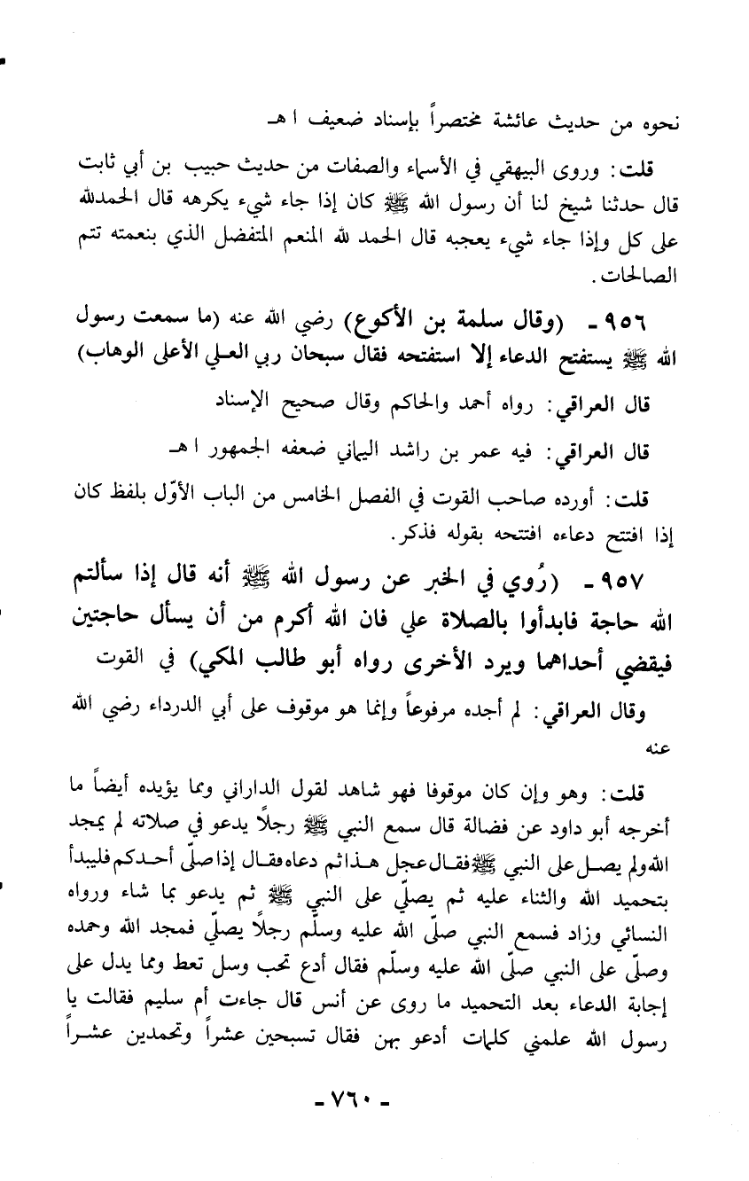 956 - (وقال سلمة بن الأكوع) رضي الله عنه (ما سمعت رسول الله - صلّى الله عليه وسلم - يستفتح الدعاء إلا استفتحه فقال سبحان ربي العلي الأعلى الوهاب)