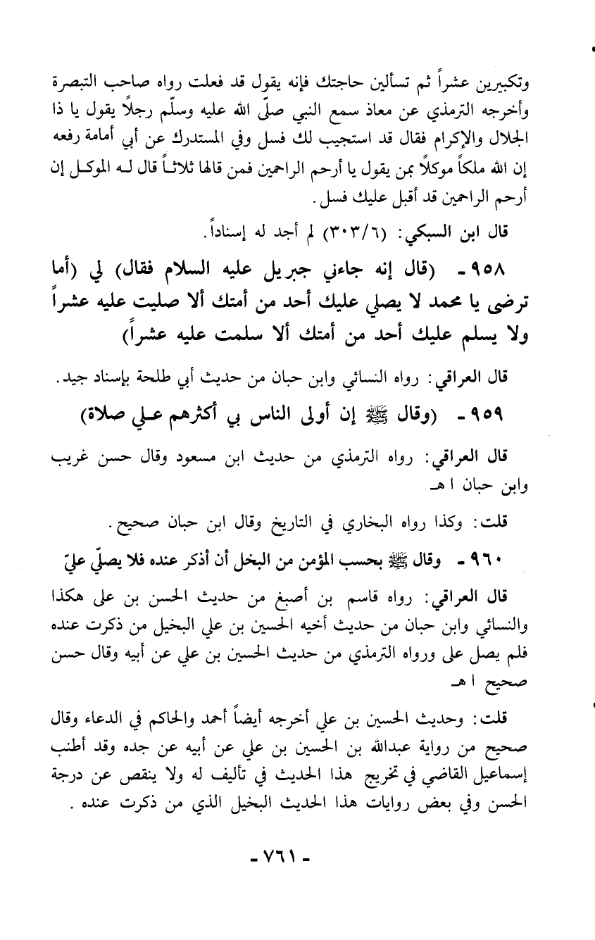 958 - (قال إنه جاءني جبريل عليه السلام فقال) لي (أما ترضى يا محمد لا يصلي عليك أحد من أمتك ألا صليت عليه عشراً ولا يسلم عليك أحد من أمتك ألا سلمت عليه عشراً)