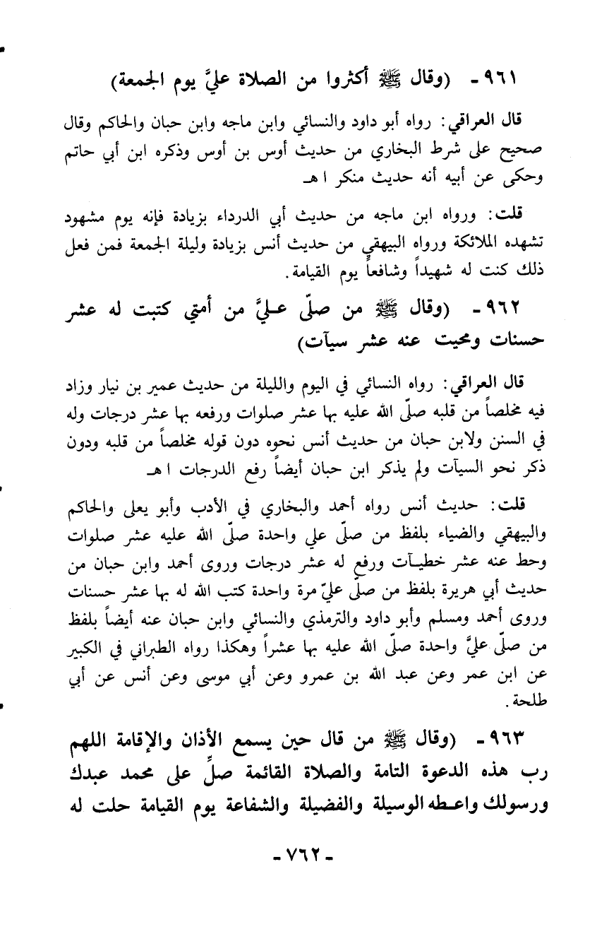 962 - (وقال - صلّى الله عليه وسلم - من صلّى علي من أمتي كتبت لى عشر حسنات ومحيت عنه عشر سيآت)