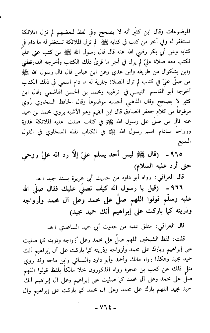 الموضوعات وقال ابن كثير أنه لا يصحح وفي لفظ لبعضهم لم تزل الملائكة تستغفر له وفي آخر من كتب في كتابه - صلّى الله عليه وسلم - لم تزل الملائكة تستغفر له ما دام في كتابه وعن أبي بكر رضي الله عنه قال قال رسول الله - صلّى الله عليه وسلم - من كتب عني علماً فكتب معه صلاة عليّ لم يزل في أجر ما قرئ ذلك الكتاب وأخرجه الدارقطني وابن بشكوال من طريقه وابن عدي وعن ابن عباس قال قال رسول الله - صلّى الله عليه وسلم - من صلّى عليّ في كتاب لم تزل الصلاة جارية له ما دام اسمي في ذلك الكتاب أخرجه أبو القاسم التيمي في ترغيبه ومحمد بن الحسن الهاشمي وقال ابن كثير لا يصحح وقال الذهبي أحسبه موضوعاً وقال الحافظ السخاوي رُوي مرفوعاً من كلام جعفر الصادق قال ابن القيم وهو الأشبه يروي محمد بن حميد عنه قال من صلّى على رسول الله - صلّى الله عليه وسلم - في كتاب صلت عليه الملائكة غدوة ورواحاً ما دام اسم رسول الله - صلّى الله عليه وسلم - في الكتاب نقله السخاوي في القول البديع.