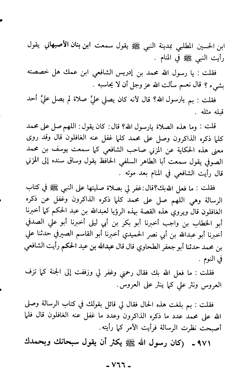 قلت: وما هذه الصلاة يا رسول الله؟ قال: كان يقول: اللهم صل على محمد كلما ذكره الذاكرون وصل على محمد كلما غفل عنه الغافلون قال وقد روى معنى هذه الحكاية عن المزني صاحب الشافعي كما سمعت يوسف بن محمد الصوفي يقول سمعت أبا الطاهر السلفي الحافظ يقول وساق سنده إلى المزني قال رأيت الشافعي في المنام بعد موته.