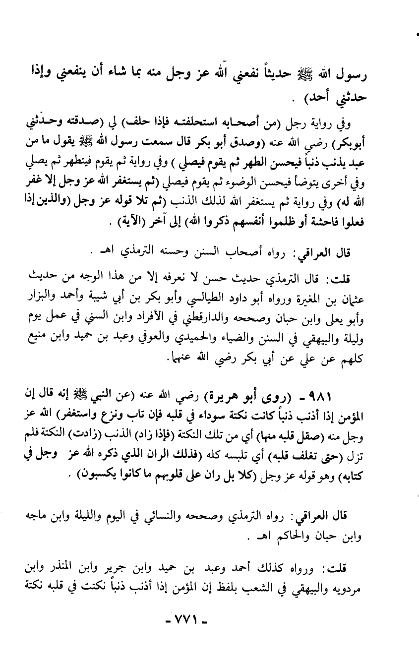 981 - (روى أبو هريرة) رضي الله عنه (عن النبي - صلّى الله عليه وسلم - أنه قال إن المؤمن إذا أذنب ذنباًَ كانت نكتة سوداء في قلبه فإن تاب ونزع واستغفر) الله عز وجل منه (صقل قلبه منها) أي من تلك النكتة (فإذا زاد) الذنب (زادت) النكتة فلم تزل (حتى تغلف قلبه) أي تلبسه كله (فذلك الران الذي ذكره الله عز وجل في كتابه) وهو قوله عز وجل (كلا بل ران على قلوبهم ما كانوا يكسبون).
