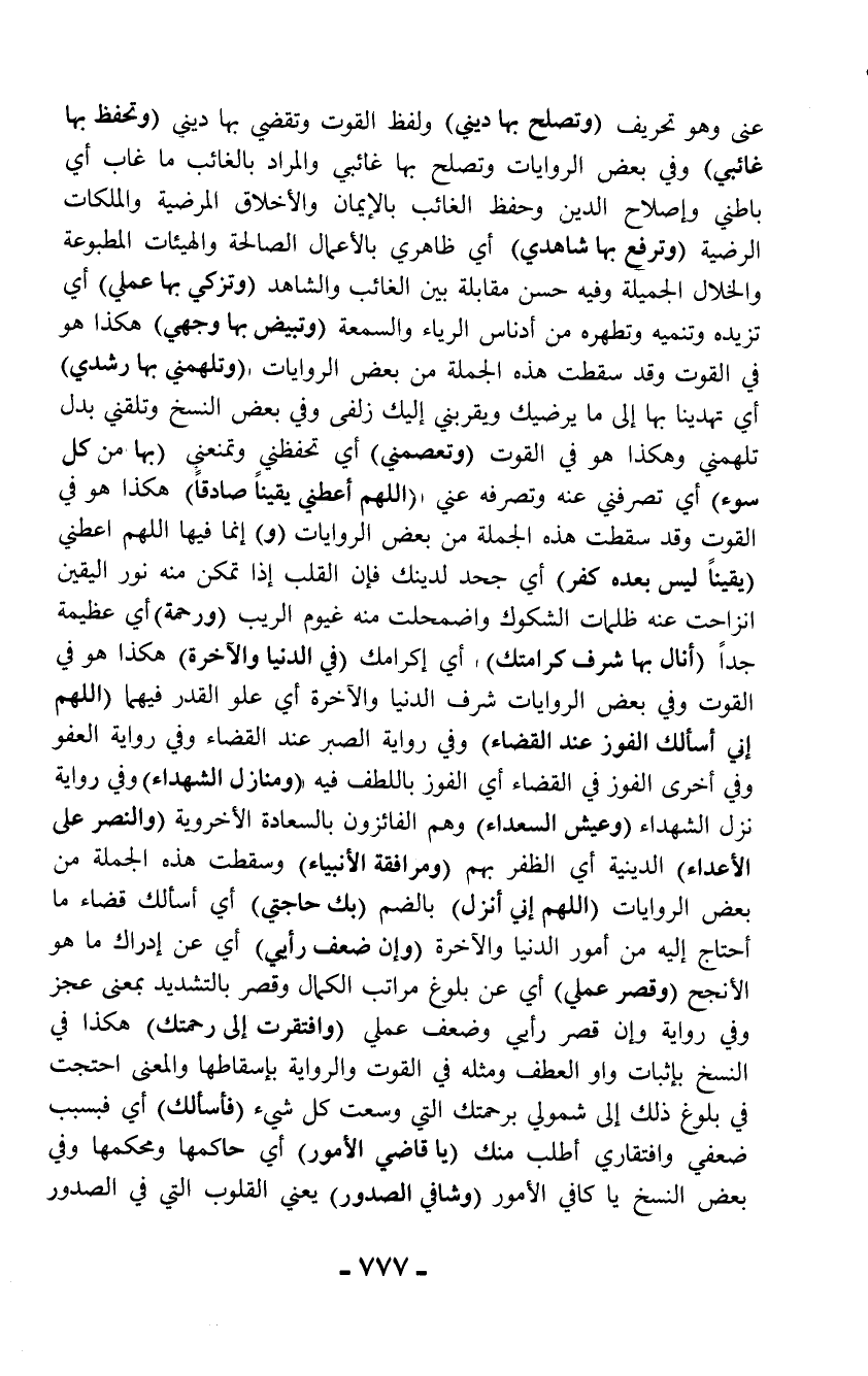 عنى وهو تحريف (وتصلح بها ديني) ولفظ القوت وتقضي بها ديني (وتحفظ بها غائبي) وفي بعض الروايات وتصلح بها غائبي والمراد بالغائب ما غاب أي باطني وإصلاح الدين وحفظ الغائب بالإيمان والأخلاق المرضية والملكات الرضية (وترفع بها شاهدي) أي ظاهري بالأعمال الصالحة والهيئات المطبوعة والخلال الجميلة وفيه حسن مقابلة بين الغائب والشاهد (وتزكي بها عملي) أي تزيده وتنميه وتطهره من أدناس الرياء والسمعة (وتبيض بها وجهي) هكذا هو في القوت وقد سقطت هذه الجملة من بعض الروايات (وتلهمني بها رشدي) أي تهدينا بها إلى ما يرضيك ويقربني إليك زلفى وفي بعض النسخ وتلقني بدل تلهمني وهكذا هو في القوت (وتعصمني) أي تحفظني وتمنعني (بها من كل سوء) أي تصرفني عنه وتصرفه عني (اللهم أعطني يقيناً صادقاً) هكذا هو في القوت وقد سقطت هذه الجملة من بعض الروايات (و) إنما فيها اللهم اعطني (يقيناً ليس بعده كفر) أي جحد لدينك فإن القلب إذا تمكن منه نور اليقين انزاحت عنه ظلمات الشكوك واضمحلت منه غيوم الريب (ورحمة) أي عظيمة جداً (أنال بها شرف كرامتك) أي إكرامك (في الدنيا والآخرة) هكذا هو في القوت وفي بعض الروايات شرف الدنيا والآخرة أي علو القدر فيهما (اللهم إني أسألك الفوز عند القضاء) وفي رواية الصبر عند القضاء وفي رواية العفو وفي أخرى الفوز في القضاء أي الفوز باللطف فيه (ومنازل الشهداء) وفي رواية نزل الشهداء (وعيش السعداء) وهم الفائزون بالسعادة الأخروية (والنصر على الأعداء) الدينية أي الظفر بهم (ومرافقة الأنبياء) وسقطت هذه الجملة من بعض الروايات (اللهم إني أنزل) بالضم (بك حاجتي) أي أسألك قضاء ما أحتاج إليه من أمور الدنيا والآخرة (وإن ضعف رأيي) أي عن إدراك ما هو الأنجح (وقصر عملي) أي عن بلوغ مراتب الكمال وقصر بالتشديد بمعنى عجز وفي رواية وإن قصر رأيي وضعف عملي (وافتقرت إلى رحمتك) هكذا في النسخ بإثبات واو العطف ومثله في القوت والرواية بإسقاطها والمعنى احتجت في بلوغ ذلك إلى شمولي برحمتك التي وسعت كل شيء (فأسالك) أي فبسبب ضعفي وافتقاري أطلب منك (يا قاضي الأمور) أي حاكمها ومحكمها وفي بعض النسخ يا كافي الأمور (وشافي الصدور) يعني القلوب التي في الصدور