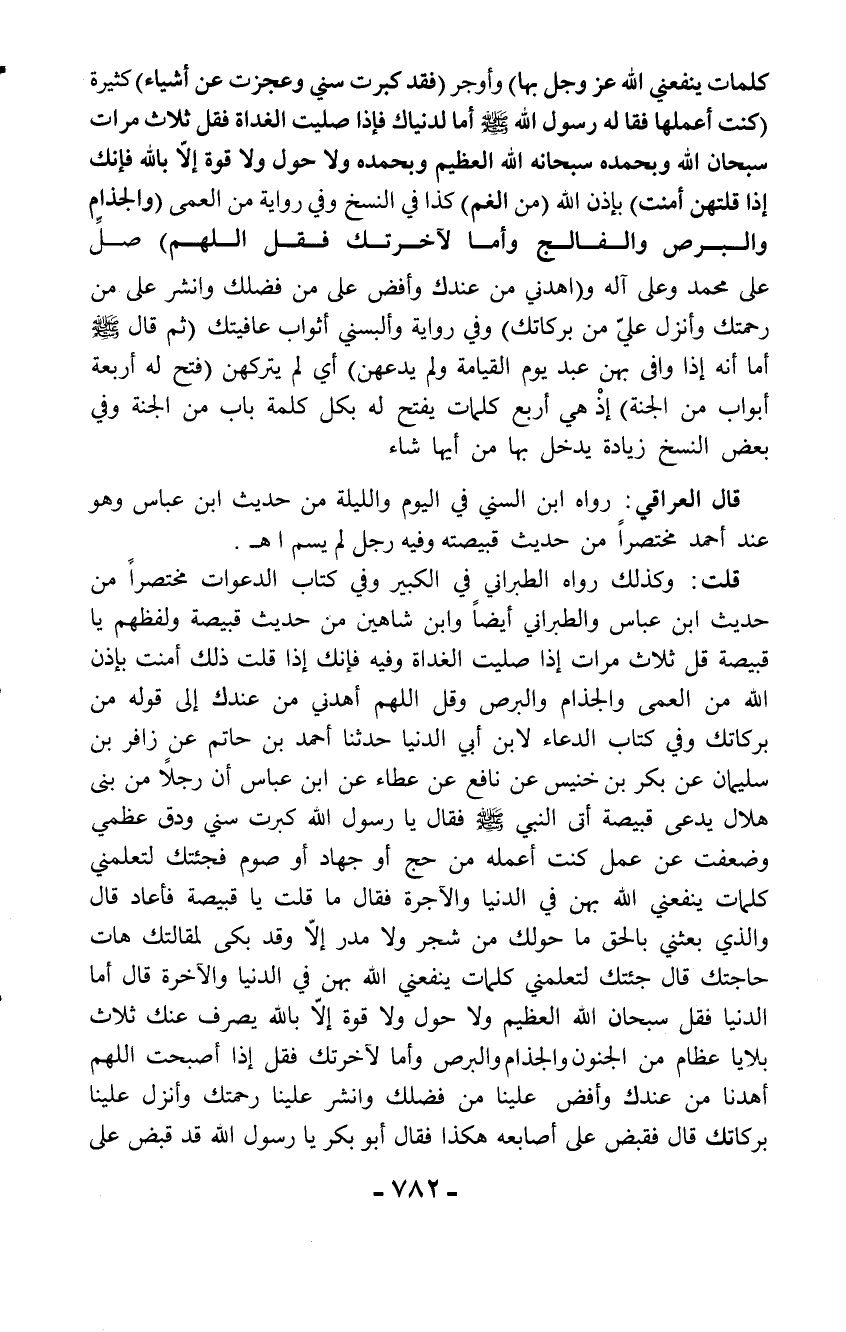 قلت: وكذلك رواه الطبراني في الكبير وفي كتاب الدعوات مختصراً من حديث ابن عباس والطبراني أيضاً وابن شاهين من حديث قبيصة ولفظهم يا قبيصة قل ثلاث مرات إذا صليت الغداة وفيه فإنك إذا قلت ذلك أمنت بإذن الله من العمى والجذام والبرص وقل اللهم أهدني من عندك إلى قوله من بركاتك وفي كتاب الدعاء لابن أبي الدنيا حدثنا أحمد بن حاتم عن زافر بن سليمان عن بكر بن خنيس عن نافع عن عطاء عن ابن عباس أن رجلاً من بنى هلال يدعى قبيصة أتى النبي - صلّى الله عليه وسلم - فقال يا رسول الله كبرت سني ودق عظمي وضعفت عن عمل كنت أعمله من حج أو جهاد أو صوم فجئتك لتعلمني كلمات ينفعني الله بهن في الدنيا والآجرة فقال ما قلت يا قبيصة فأعاد قال والذي بعثني بالحق ما حولك من شجر ولا مدر إلاَّ وقد بكى لمقالتك هات حاجتك قال جئتك لتعلمني كلمات ينفعني الله بهن في الدنيا والآخرة قال أما الدنيا فقل سبحان الله العظيم ولا حول ولا قوة إلاّ بالله يصرف عنك ثلاث بلايا عظام من الجنون والجذام والبرص وأما لآخرتك فقل إذا أصبحت اللهم أهدنا من عندك وأفض علينا من فضلك وانشر علينا رحمتك وأنزل علينا بركاتك قال فقبض على أصابعه هكذا فقال أبو بكر يا رسول الله قد قبض على