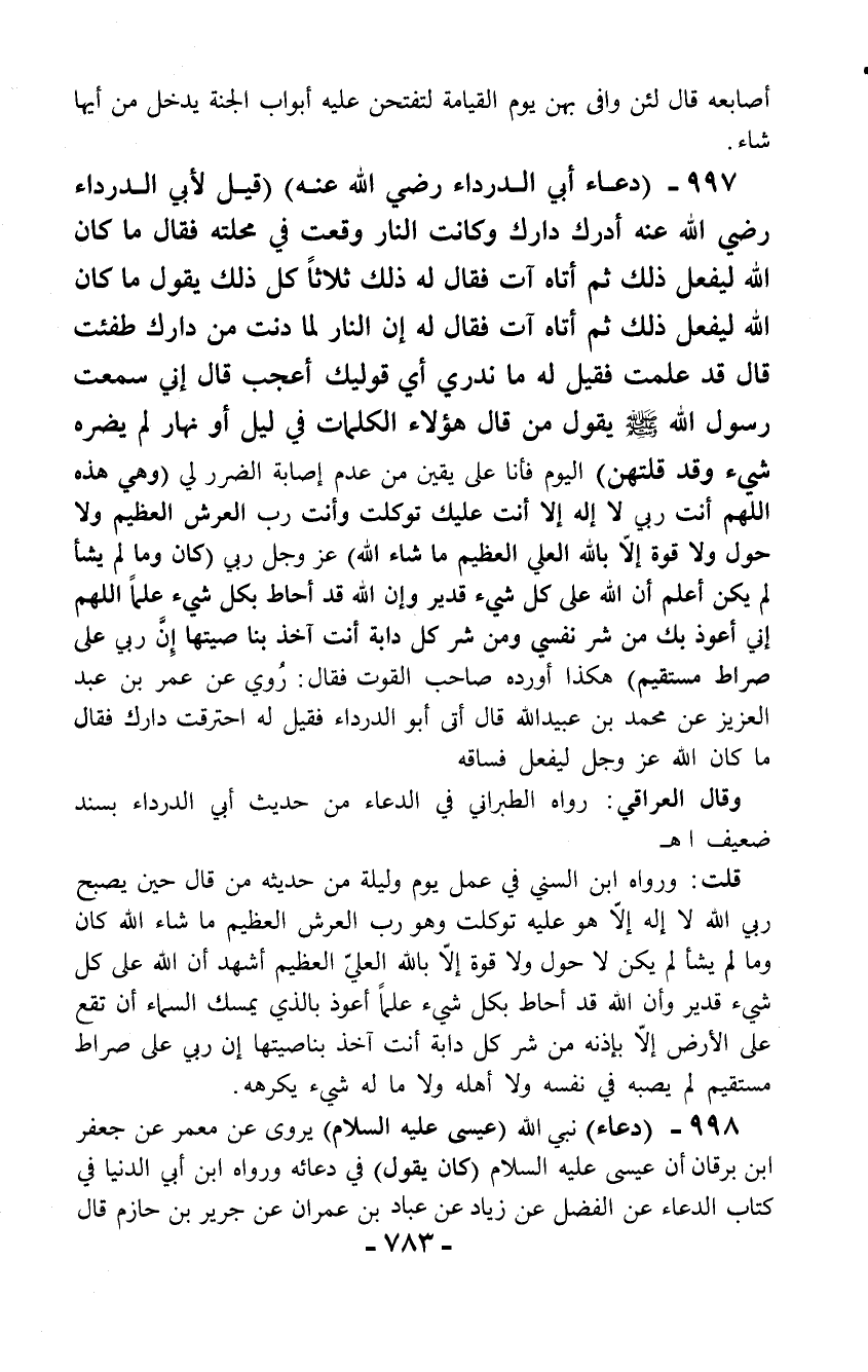 997 - (دعاء أبي الدرداء رضي الله عنه) (قيل لأبي الدرداء رضي الله عنه أدرك دارك وكانت النار وقعت في محلته فقال ما كان الله ليفعل ذلك ثم أتاه آت فقال له ذلك ثلاثاً كل ذلك يقول ما كان الله ليفعل ذلك ثم أتاه آت فقال له إن النار لما دنت من دارك طفئت قال قد علمت فقيل له ما ندري أي قوليك أعجب قال إني سمعت رسول الله - صلّى الله عليه وسلم - يقول من قال هؤلاء الكلمات في ليل أو نهار لم يضره شيء وقد قلتهن) اليوم فأنا على يقين من عدم إصابة الضرر لي (وهي هذه اللهم أنت ربي لا إله إلا أنت عليك توكلت وأنت رب العرش العظيم ولا حول ولا قوة إلا بالله العلي العظيم ما شاء الله) عز وجل ربي (كان وما لم يشأ لم يكن أعلم أن الله على كل شيء قدير وإن الله قد أحاط بكل شيء علماً اللهم إني أعوذ بك من شر نفسي ومن شر كل دابة أنت آخذ بنا صيتها إنَّ ربي على صراط مستقيم) هكذا أورده صاحب القوت فقال: رُوي عن عمر بن عبد العزيز عن محمد بن عبيد الله قال أتى أبو الدرداء فقيل له احترقت دارك فقال ما كان الله عز وجل ليفعل فساقه