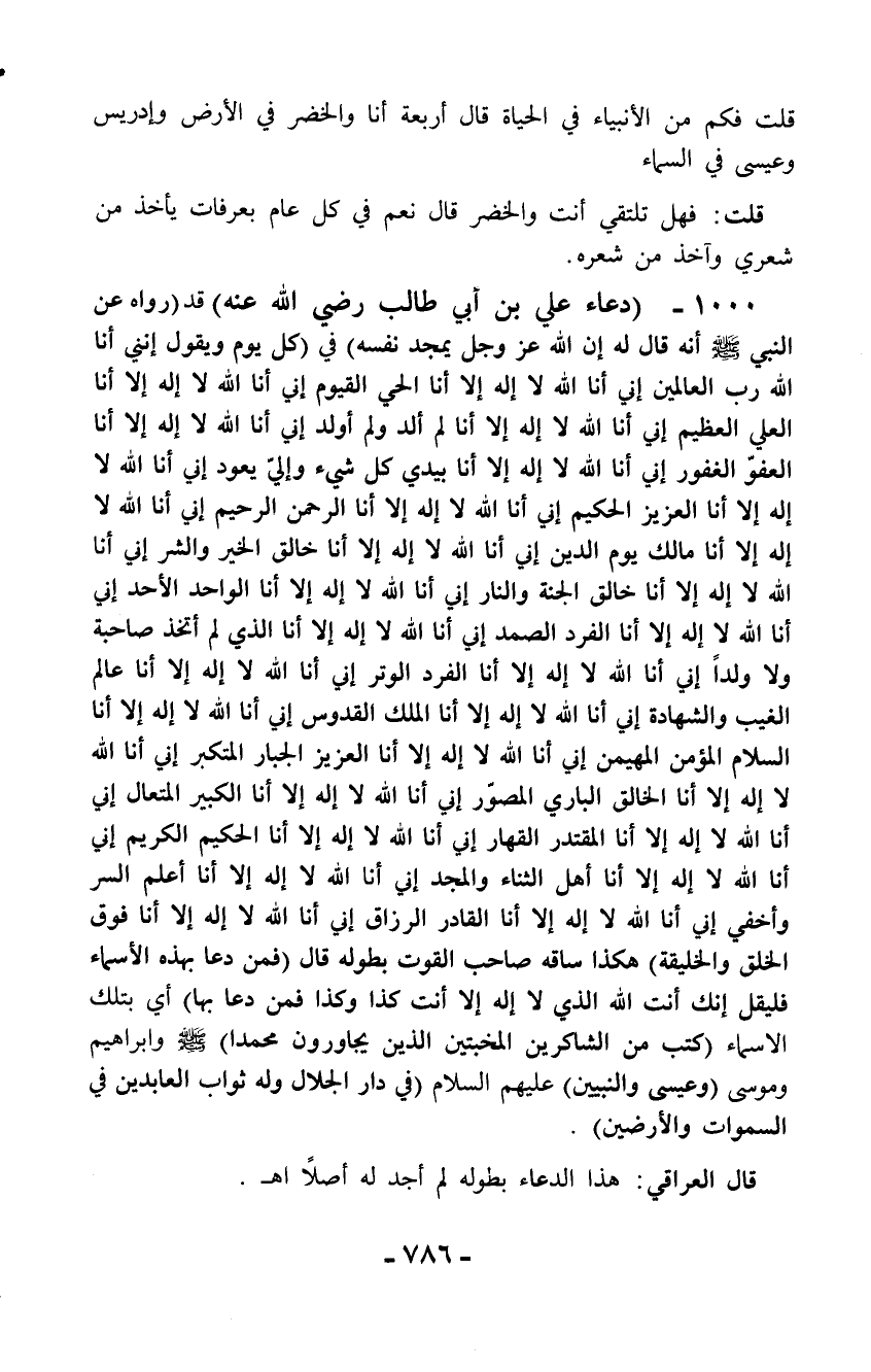 1000 - (دعاء علي بن أبي طالب رضي الله عنه) قد (رواه عن النبي - صلّى الله عليه وسلم - أنه قال له إن الله عز وجل يمجد نفسه) في (كل يوم ويقول إنني أنا الله رب العالمين إني أنا الله لا إله إلا أنا الحي القيوم إني أنا الله لا إله إلا أنا العلي العظيم إني أنا الله لا إله إلا أنا لم ألد ولم أولد إني أنا الله لا إله إلا أنا العفوّ الغفور إني أنا الله لا إله إلا أنا بيدي كل شيء وإليّ يعود إني أنا الله لا إله إلا أنا العزيز الحكيم إني أنا الله لا إله إلا أنا الرحمن الرحيم إني أنا الله لا إله إلا أنا مالك يوم الدين إني أنا الله لا إله إلا أنا خالق الخير والشر إني أنا الله لا إله إلا أنا خالق الجنة والنار إني أنا الله لا إله إلا أنا الواحد الأحد إني أنا الله لا إله إلا أنا الفرد الصمد إني أنا الله لا إله إلا أنا الذي لم أتخذ صاحبة ولا ولداً إني أنا الله لا إله إلا أنا الفرد الوتر إني أنا الله لا إله إلا أنا عالم الغيب والشهادة إني أنا الله لا إله إلا أنا الملك القدوس إني أنا الله لا إله إلا أنا السلام المؤمن المهيمن إني أنا الله لا إله إلا أنا العزيز الجبار المتكبر إني أنا الله لا إله إلا أنا الخالق الباري المصور إني أنا الله لا إله إلا أنا الكبير المتعال إني أنا الله لا إله إلا أنا المقتدر القهار إني أنا الله لا إله إلا أنا الحكيم الكريم إني أنا الله لا إله إلا أنا أهل الثناء والمجد إني أنا الله لا إله إلا أنا أعلم السر وأخفى إني أنا الله لا إله إلا أنا القادر الرزاق إني أنا الله لا إله إلا أنا فوق الخلق والخليقة) هكذا ساقه صاحب القوت بطوله قال (فمن دعا بهذه الأسماء فليقل إنك أنت الله الذي لا إله إلا أنت كذا وكذا فمن دعا بها) أي بتلك الأسماء (كتب من الشاكرين المخبتين الذين يجاورون محمدًا) - صلّى الله عليه وسلم - وإبراهيم وموسى (وعيسى والنبيين) عليهم السلام (في دار الجلال وله ثواب العابدين في السماوات والأرضين).