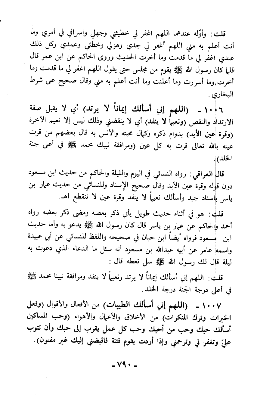 1006 - (اللهم إني أسألك إيماناً لا يرتد) أي لا يقبل صفة الارتداد والنقص (ونعيما لا ينفد) أي لا ينقصني وذلك ليس إلا نعيم الآخرة (وقرة عين الأبد) بدوام ذكره وكمال محبته والأنس به قال بعضهم من قرت عينه بالله تعالى قرت به كل عين (ومرافقة نبيك محمد - صلّى الله عليه وسلم - في أعلى جنة الخلد).