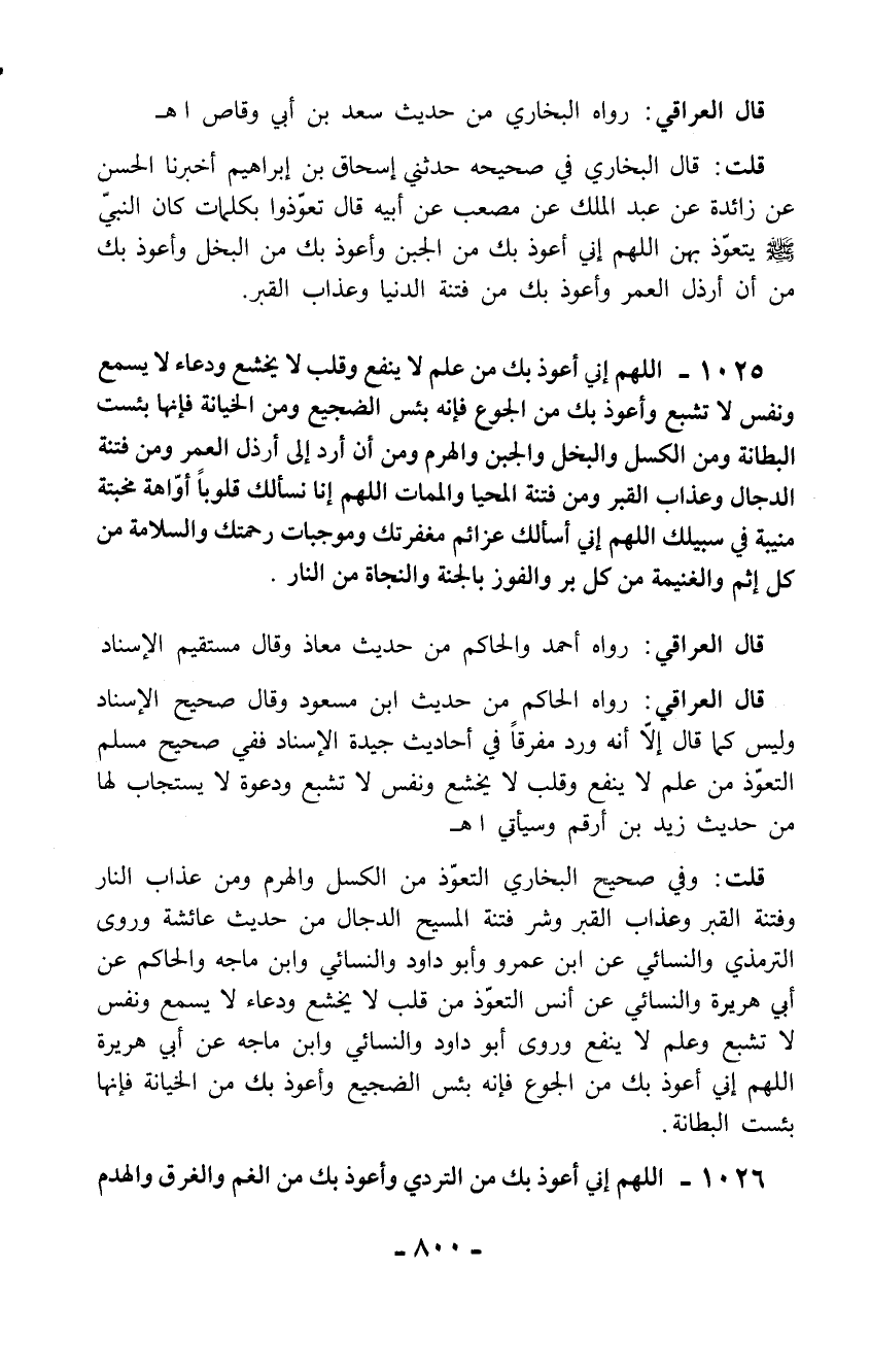 1025 - اللهم إني أعوذ بك من علم لا ينفع وقلب لا يخشع ودعاء لا يسمع ونفس لا تشبع وأعوذ بك من الجوع فإنه بئس الضجيع ومن الخيانة فإنها بئست البطانة ومن الكسل والبخل والجبن والهرم ومن أن أرد إلى أرذل العمر ومن فتنة الدجال وعذاب القبر ومن فتنة المحيا والممات اللهم إنا نسألك قلوباً أوّاهة مخبتة منيبة في سبيلك اللهم إني أسألك عزائم مغفرتك وموجبات رحمتك والسلامة من كل إثم والغنيمة من كل بر والفوز بالجنة والنجاة من النار.