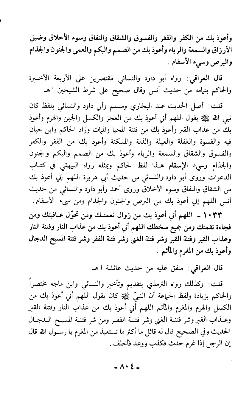 1033 - اللهم إني أعوذ بك من زوال نعمتك ومن تحوّل عافيتك ومن فجاءة نقمتك ومن جميع سخطك اللهم إني أعوذ بك من عذاب النار وفتنة النار وعذاب القبر وفتنة القبر وشر فتنة الغنى وشر فتنة الفقر وشر فتنة المسيح الدجال وأعوذ بك من المغرم والمأثم.