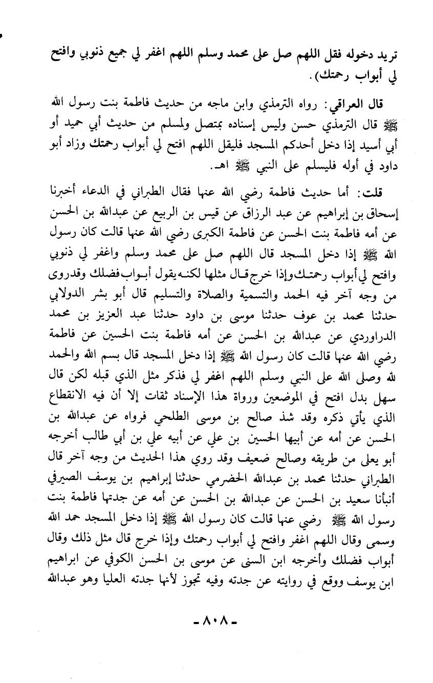 قلت: أما حديث فاطمة رضي الله عنها فقال الطبراني في الدعاء أخبرنا إسحاق بن إبراهيم عن عبد الرزاق عن قيس بن الربيع عن عبد الله بن الحسن عن أمه فاطمة بنت الحسن عن فاطمة الكبرى رضي الله عنها قالت كان رسول الله - صلّى الله عليه وسلم - إذا دخل المسجد قال اللهم صل على محمد وسلم واغفر لي ذنوبي وافتح لي أبواب رحمتك وإذا خرج قال مثلها لكنه يقول أبواب فضلك وقد روى من وجه آخر فيه الحمد والتسمية والصلاة والتسليم قال أبو بشر الدولابي حدثنا محمد بن عوف حدثنا موسى بن داود حدثنا عبد العزيز بن محمد الدراوردي عن عبد الله بن الحسن عن أمه فاطمة بنت الحسين عن فاطمة رضي الله عنها قالت كان رسول الله - صلّى الله عليه وسلم - إذا دخل المسجد قال بسم الله والحمد لله وصلى الله على النبي وسلم اللهم اغفر لي فذكر مثل الذي قبله لكن قال سهل بدل افتح في الموضعين ورواة هذا الإسناد ثقات إلا أن فيه الانقطاع الذي يأتي ذكره وقد شذ صالح بن موسى الطلحي فرواه عن عبد الله بن الحسن عن أمه عن أبيها الحسين بن علي عن أبيه علي بن أبي طالب أخرجه أبو يعلى من طريقه وصالح ضعيف وقد روي هذا الحديث من وجه آخر قال الطبراني حدثنا محمد بن عبد الله الحضرمي حدثنا إبراهيم بن يوسف الصيرفي أنبأنا سعيد بن الحسن عن عبد الله بن الحسن عن أمه عن جدتها فاطمة بنت رسول الله - صلّى الله عليه وسلم - رضي عنها قالت كان رسول الله - صلّى الله عليه وسلم - إذا دخل المسجد حمد الله وسمى وقال اللهم اغفر وافتح لي أبواب رحمتك وإذا خرج قال مثل ذلك وقال أبواب فضلك وأخرجه ابن السني عن موسى بن الحسن الكوفي عن إبراهيم ابن يوسف ووقع في روايته عن جدته وفيه تجوز لأنها جدته العليا وهو عبد الله