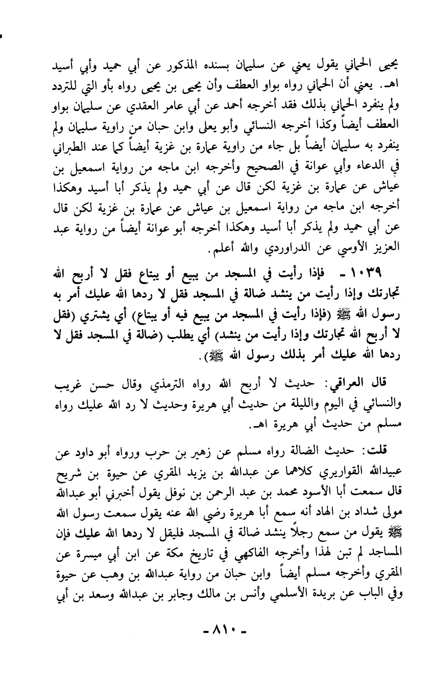 1039 - فإذا رأيت في المسجد من يبيع أو يبتاع فقل لا أربح الله تجارتك وإذا رأيت من ينشد ضالة في المسجد فقل لا ردها الله عليك أمر به رسول الله - صلّى الله عليه وسلم - (فإذا رأيت في المسجد من يبيع فيه أو يبتاع) أي يشتري (فقل لا أربح الله تجارتك وإذا رأيت من ينشد) أي يطلب (ضالة في المسجد فقل لا ردها الله عليك أمر بذلك رسول الله - صلّى الله عليه وسلم -).