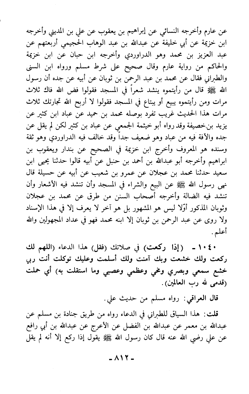 1040 - (إذا ركعت) في صلاتك (فقل) هذا الدعاء (اللهم لك ركعت ولك خشعت وبك آمنت ولك أسلمت وعليك توكلت أنت ربي خشع سمعي وبصري ومخي وعظمي وعصبي وما استقلت به) أي حملت (قدمى لله رب العالمين).
