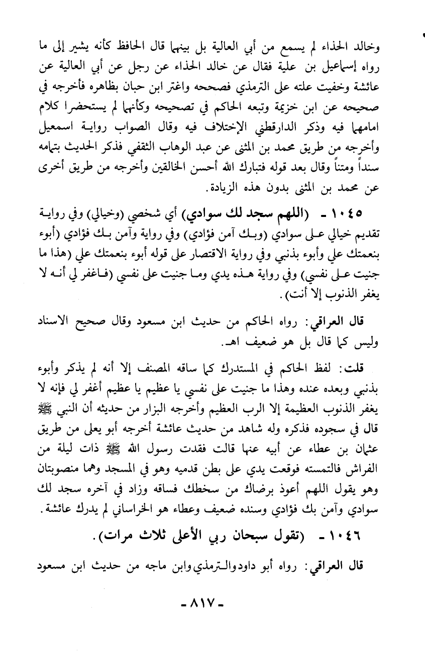 1045 - (اللهم سجد لك سوادي) أي شخصي (وخيالي) وفي رواية تقديم خيالي على سوادي (وبك آمن فؤادي) وفي رواية وآمن بك فؤادي (أبوء بنعمتك علي وأبوء بذنبي وفي رواية الاقتصار على قوله أبوء بنعمتك علي (هذا ما جنيت على نفسي) وفي رواية هذه يدي وما جنيت على نفسي (فاغفر لي أنه لا يغفر الذنوب إلا أنت).