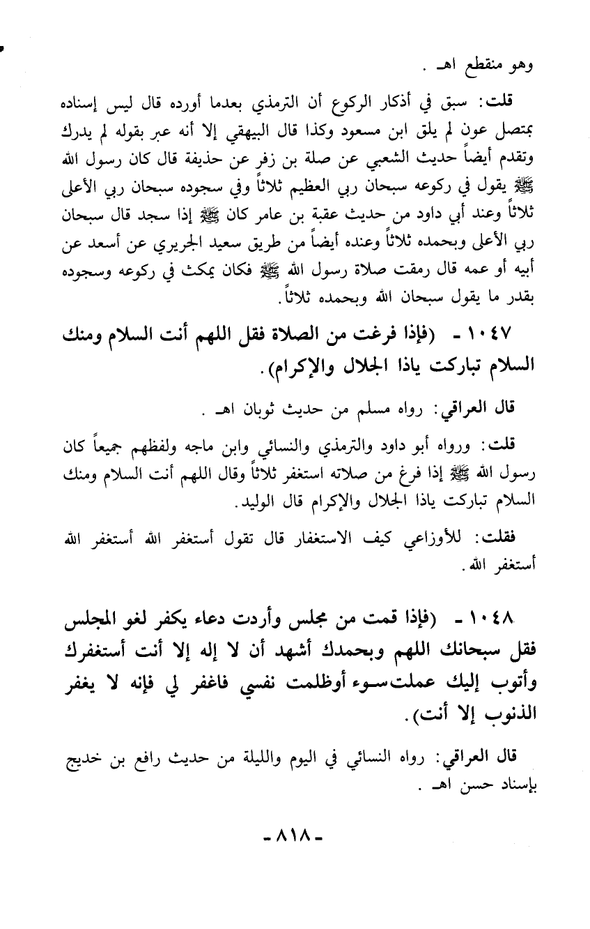 1047 - (فإذا فرغت من الصلاة فقل اللهم أنت السلام ومنك السلام تباركت ياذا الجلال والإكرام).
