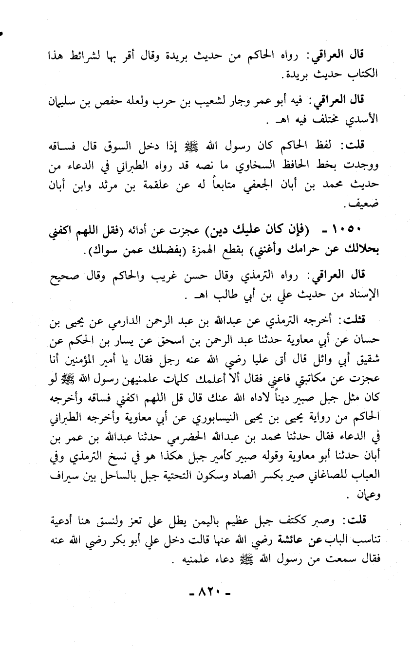 1050 - (فإن كان عليك دين) عجزت عن أدائه (فقل اللهم اكفني بحلالك عن حرامك واغنني) بقطع الهمزة (بفضلك عمن سواك).