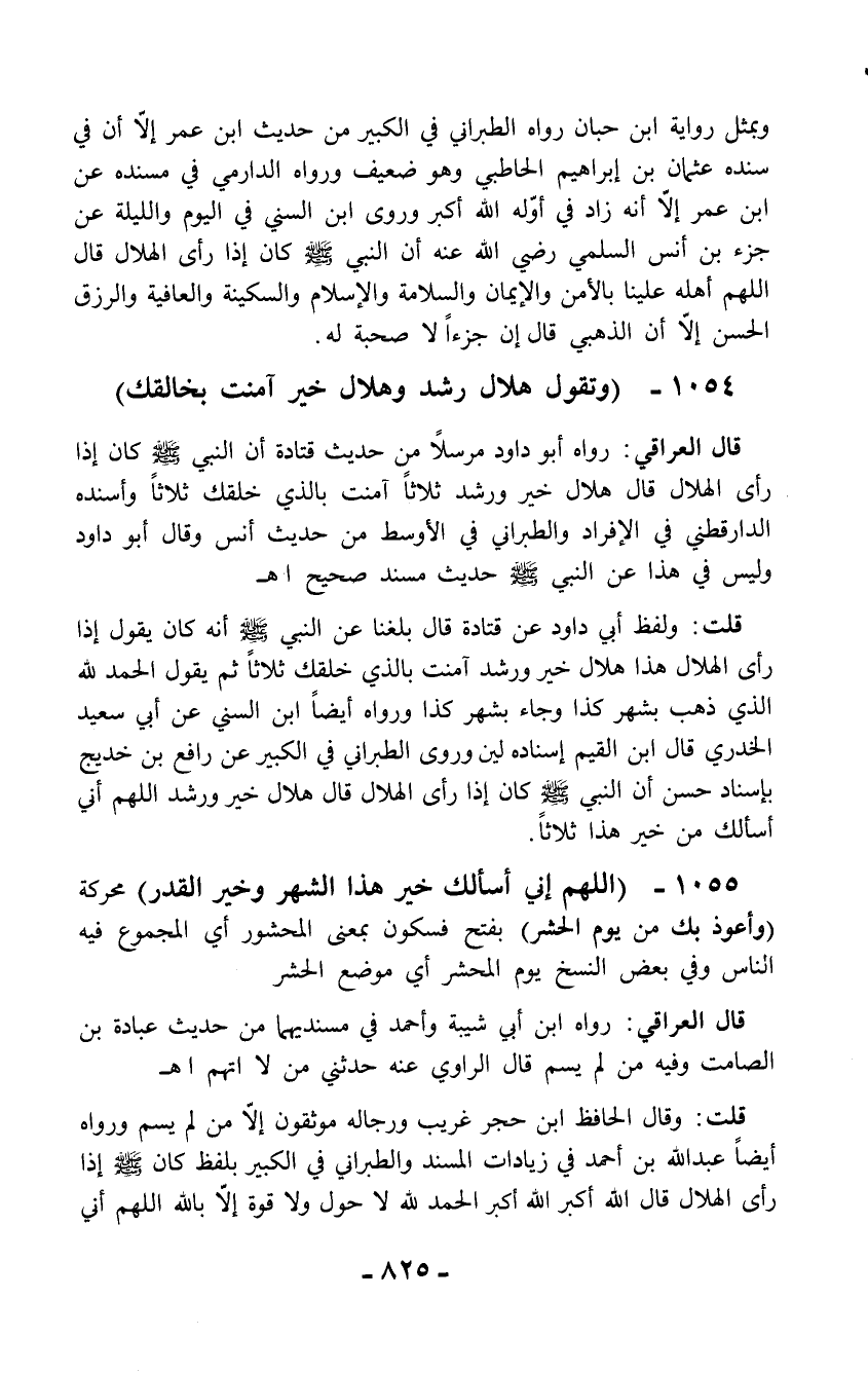 قلت: وقال الحافظ ابن حجر غريب ورجاله موثقون إلاَّ من لم يسم ورواه أيضاً عبد الله بن أحمد في زيادات المسند والطبراني في الكبير بلفظ كان - صلّى الله عليه وسلم - إذا رأى الهلال قال الله أكبر الله أكبر الحمد لله لا حول ولا قوة إلاَّ بالله اللهم إني