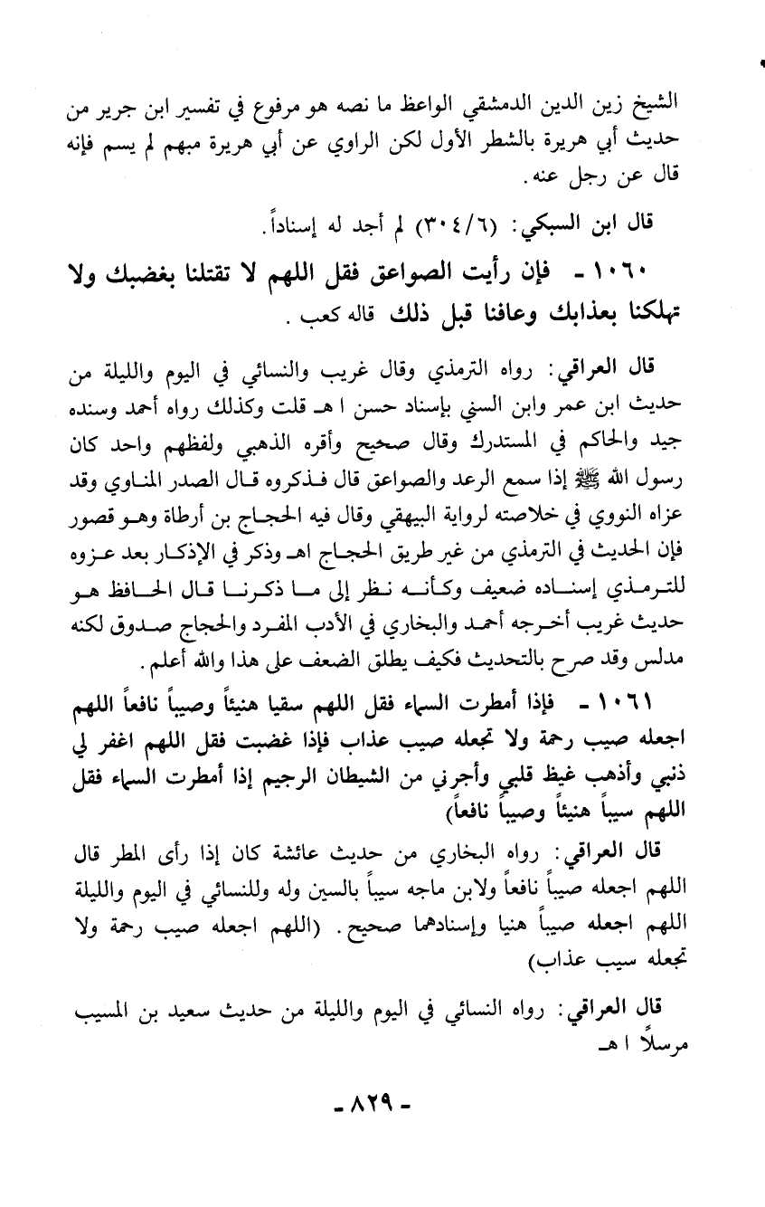 1061 - فإذا أمطرت السماء فقل اللهم سقيا هنيئاً وصيباً نافعاً اللهم اجعله صيب رحمة ولا تجعله صيب عذاب فإذا غضبت فقل اللهم اغفر لي ذنبي وأذهب غيظ قلبي وأجرني من الشيطان الرجيم إذا أمطرت السماء فقل اللهم سيباً هنيئاً وصيباً نافعاً)