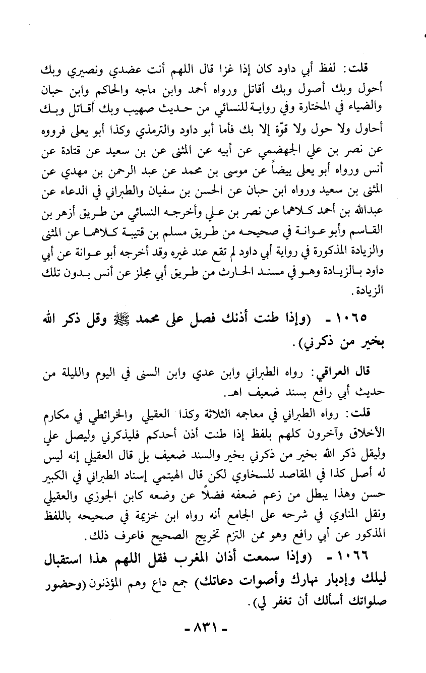 1066 - (وإذا سمعت أذان المغرب فقل اللهم هذا استقبال ليلك وإدبار نهارك وأصوات دعاتك) جمع داع وهم المؤذنون (وحضور صلواتك أسألك أن تغفر لي).