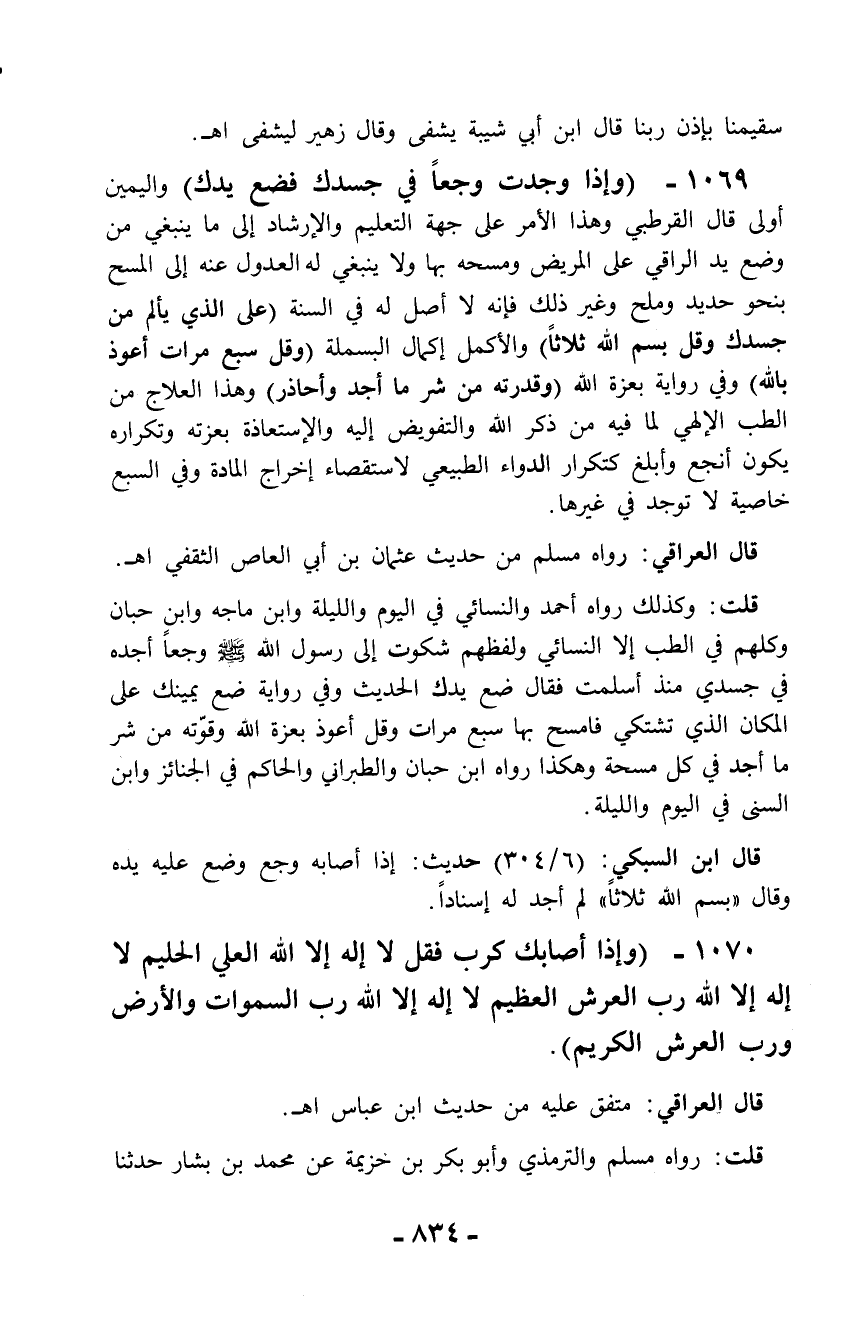 1069 - (وإذا وجدت وجعاً في جسدك فضع يدك) واليمين أولى قال القرطبي وهذا الأمر على جهة التعليم والإرشاد إلى ما ينبغي من وضع يد الراقي على المريض ومسحه بها ولا ينبغي له العدول عنه إلى المسح بنحو حديد وملح وغير ذلك فإنه لا أصل له في السنة (على الذي يألم من جسدك وقل بسم الله ثلاثاً) والأكمل إكمال البسملة (وقل سبع مرات أعوذ بالله) وفي رواية بعزة الله (وقدرته من شر ما أجد وأحاذر) وهذا العلاج من الطب الإلهي لما فيه من ذكر الله والتفويض إليه والاستعاذة بعزته وتكراره يكون أنجع وأبلغ كتكرار الدواء الطبيعي لاستقصاء إخراج المادة وفي السبع خاصية لا توجد في غيرها.