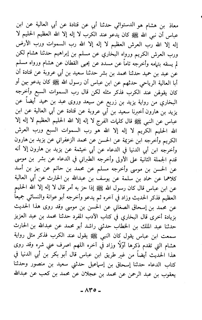 معاذ بن هشام هو الدستوائي حدثنا أبي عن قتادة عن أبي العالية عن ابن عباس أن نبي الله - صلّى الله عليه وسلم - كان يدعو عند الكرب لا إله إلا الله العظيم الحليم لا إله إلا الله رب العرش العظيم لا إله إلا الله رب السماوات ورب الأرض ورب العرش الكريم ورواه البخاري عن مسلم بن إبراهيم حدثنا هشام لكن لم يسقه بتمامه وأخرجه تاماً عن مسدد عن يحيى القطان عن هشام ورواه مسلم عن عبد بن حميد حدثنا محمد بن بشر حدثنا سعيد بن أبي عروبة عن قتادة أن أبا العالية الرياحي حدثهم عن ابن عباس أن رسول الله - صلّى الله عليه وسلم - كان يدعو بهن أو كان يقولهن عند الكرب فذكر مثله لكن قال رب السماوات السبع وأخرجه البخاري من رواية يزيد بن زريع عن سيعد وروى عبد بن حميد أيضاً عن يزيد بن هارون أخبرنا سعيد بن أبي عروبة عن قتادة عن أبي العالية عن ابن عباس عن النبي - صلّى الله عليه وسلم - قال كلمات الفرج لا إله إلا الله الحليم العظيم لا إله إلا الله الحليم الكريم لا إله إلا الله هو رب السماوات السبع ورب العرش الكريم وأخرجه ابن خزيمة عن الحسن عن محمد الزعفراني عن يزيد بن هارون وأخرجه ابن أبي الدنيا في الدعاء عن أبي خيثمة عن يزيد بن هارون إلا أنه قدم الجملة الثانية على الأولى وأخرجه الطبراني في الدعاء عن بشر بن موسى عن الحسن بن موسى وأخرجه مسلم عن محمد بن حاتم عن بهز بن أسد كلاهما عن حماد بن سلمة عن يوسف بن عبد الله بن الحارث عن أبي العالية عن ابن عباس قال كان رسول الله - صلّى الله عليه وسلم - إذا حز به أمر قال لا إله إلا الله الحليم العظيم فذكر الحديث وزاد في آخره ثم يدعو وأخرجه أبو عوانة والنسائي جميعاً عن محمد بن إسحاق الصغاني عن الحسن بن موسى وقد روى هذا الحديث بزيادة أخرى قال البخاري في كتاب الأدب المفرد حدثنا محمد بن عبد العزيز حدثنا عبد الملك بن الخطاب حدثني راشد أبو محمد عن عبد الله بن الحارث سمعت ابن عباس يقول كان النبي - صلّى الله عليه وسلم - يقول عند الكرب فذكر مثل رواية هشام التي تقدم ذكرها أوّلاً وزاد في آخره اللهم اصرف عني شره وقد روى هذا الحديث أيضاً من غير طريق ابن عباس قال أبو بكر بن أبي الدنيا في كتاب الدعاء حدثنا إسحاق بن إسماعيل حدثني سعيد بن منصور وحدثنا يعقوب بن عبد الرحمن عن محمد بن عجلان عن محمد بن كعب عن عبد الله