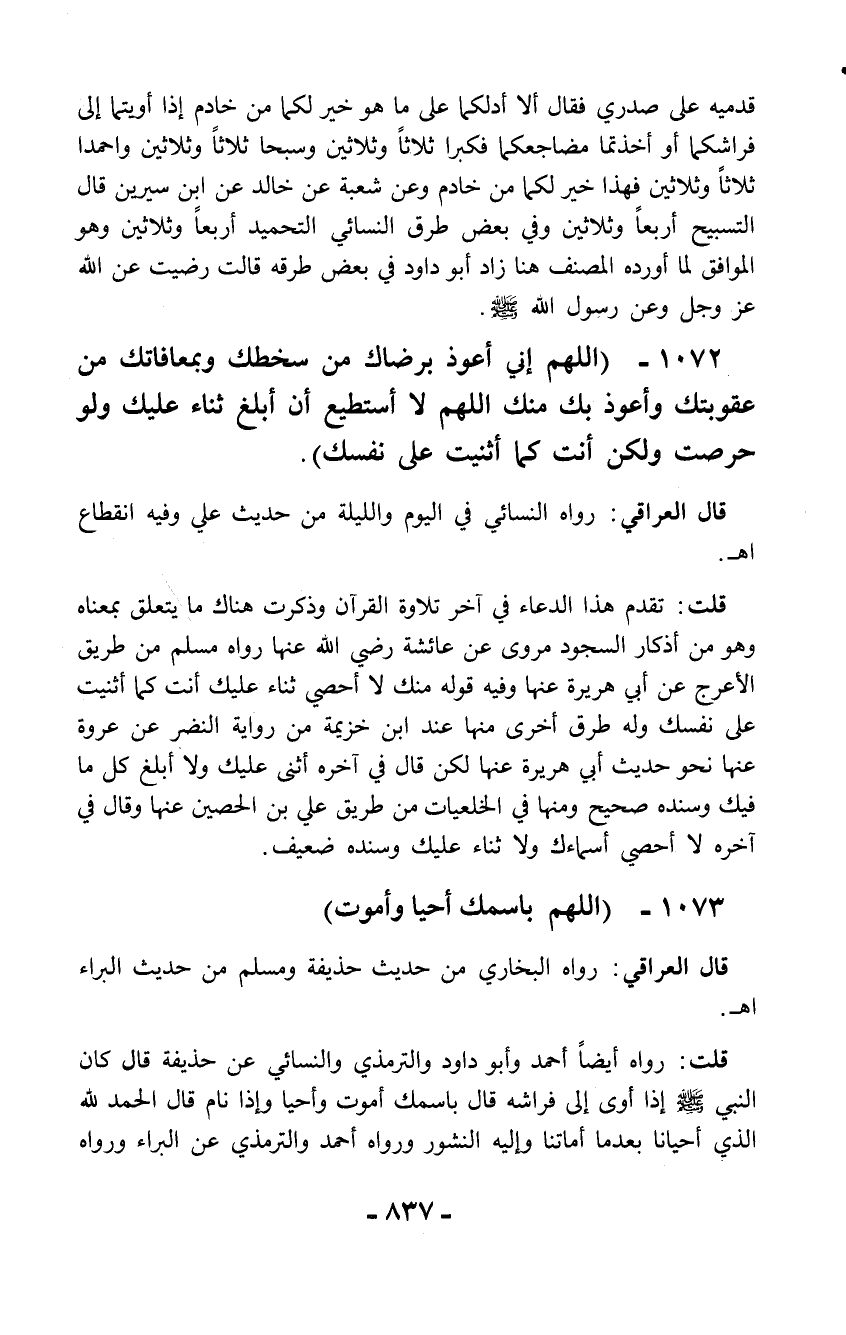 1072 - (اللهم إني أعوذ برضاك من سخطك وبمعافاتك من عقوبتك وأعوذ بك منك اللهم لا أستطيع أن أبلغ ثناء عليك ولو حرصت ولكن أنت كما أثنيت على نفسك).