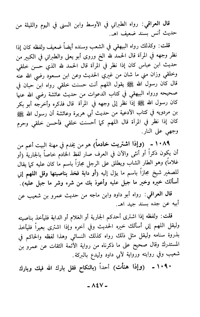 1089 - (وإذا اشتريت خادماً) هو من يخدم في مهنة البيت أعم من أن يكون ذكراً أو أنثى والآن في العرف صار لفظ الخادم خاصاً بالجارية (أو غلاماً) وهو الطار الشاب ويطلق على الرجل مجازاً باسم ما كان عليه كما يقال للصغير شيخ مجازاً باسم ما يؤل إليه (أو دابة فخذ بناصيتها وقل اللهم إني أسألك خيره وخير ما جبل عليه وأعوذ بك من شره وشر ما جبل عليه).