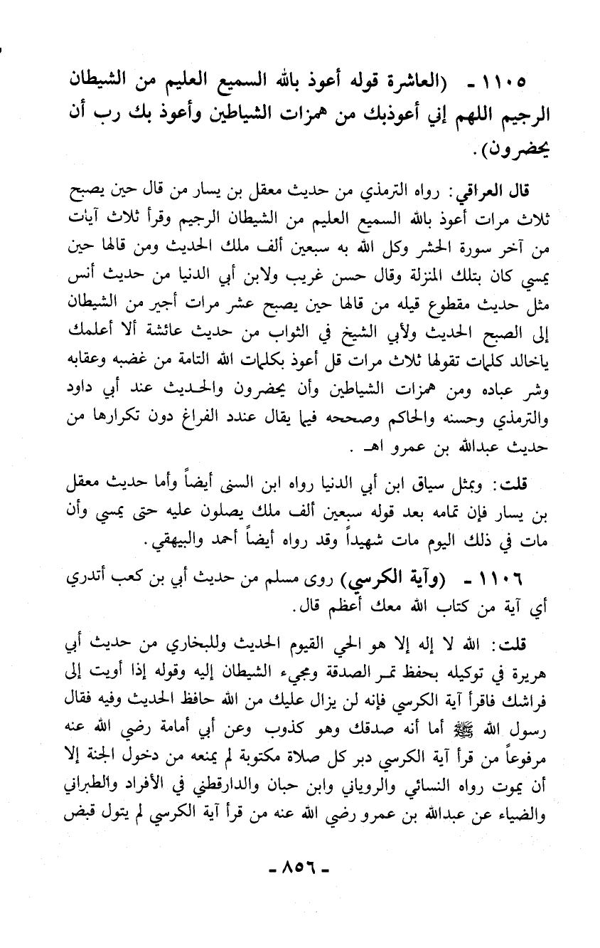 1105 - (العاشرة قوله أعوذ بالله السميع العليم من الشيطان الرجيم اللهم إني أعوذ بك من همزات الشياطين وأعوذ بك رب أن يحضرون).