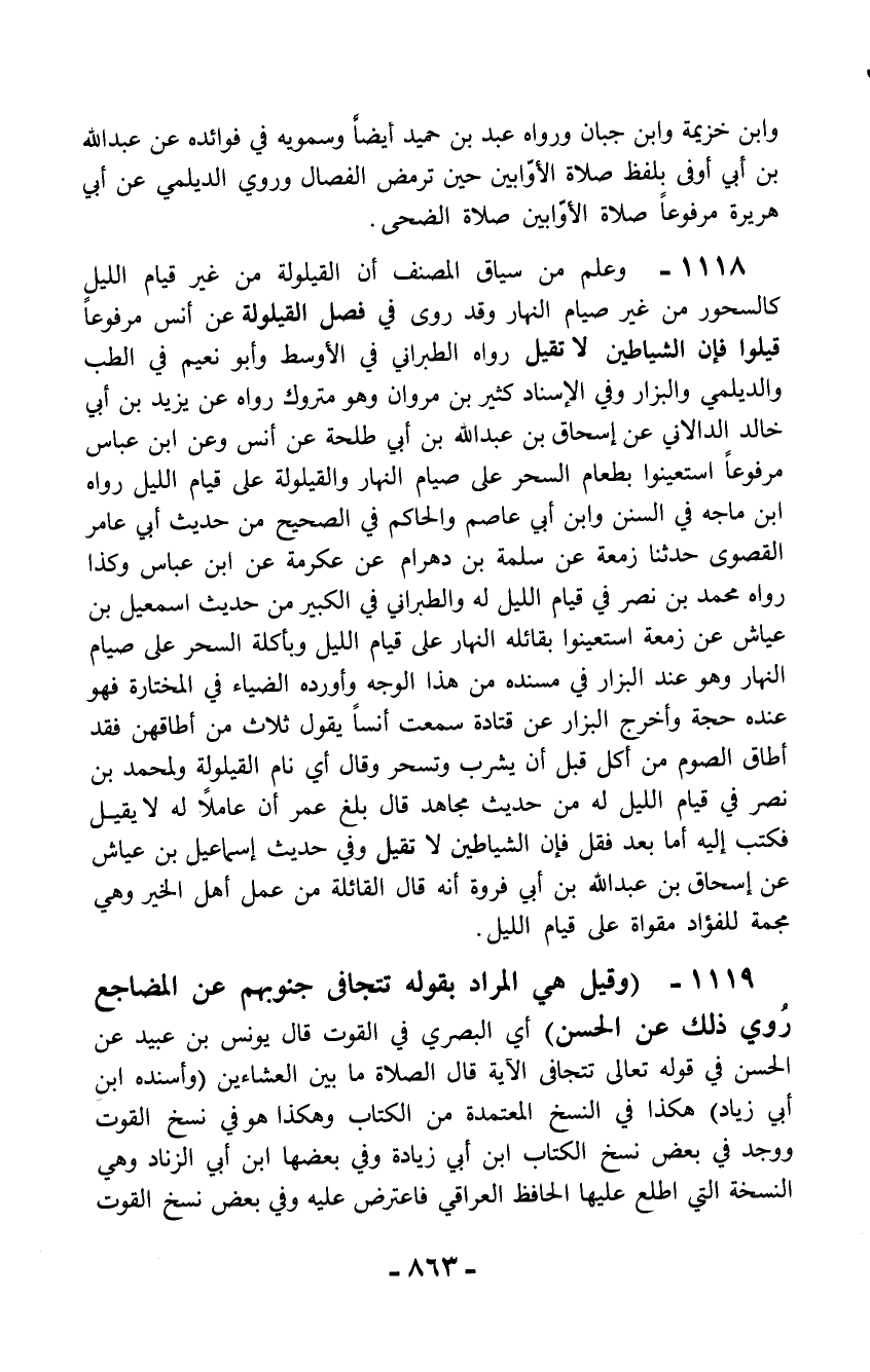 1119 - (وقيل هي المراد بقوله تتجافى جنوبهم عن المضاجع رُوي ذلك عن الحسن) أي البصري في القوت قال يونس بن عبيد عن الحسن في قوله تعالى تتجافى الآية قال الصلاة ما بين العشاءين (وأسنده ابن أبي زياد) هكذا في النسخ المعتمدة من الكتاب وهكذا هو في نسخ القوت ووجد في بعض نسخ الكتاب ابن أبي زيادة وفي بعضها ابن أبي الزناد وهي النسخة التي اطلع عليها الحافظ العراقي فاعترض عليه وفي بعض نسخ القوت