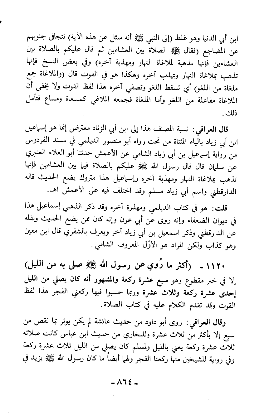 1120 - (أكثر ما رُوي عن رسول الله - صلّى الله عليه وسلم - صلّى به من الليل) إلا في خبر مقطوع وهو سبع عشرة ركعة والمشهور أنه كان يصلي من الليل إحدى عشرة ركعة وثلاث عشرة وربما حسبوا فيها ركعتي الفجر هذا لفظ القوت وقد تقدم الكلام عليه في كتاب الصلاة.