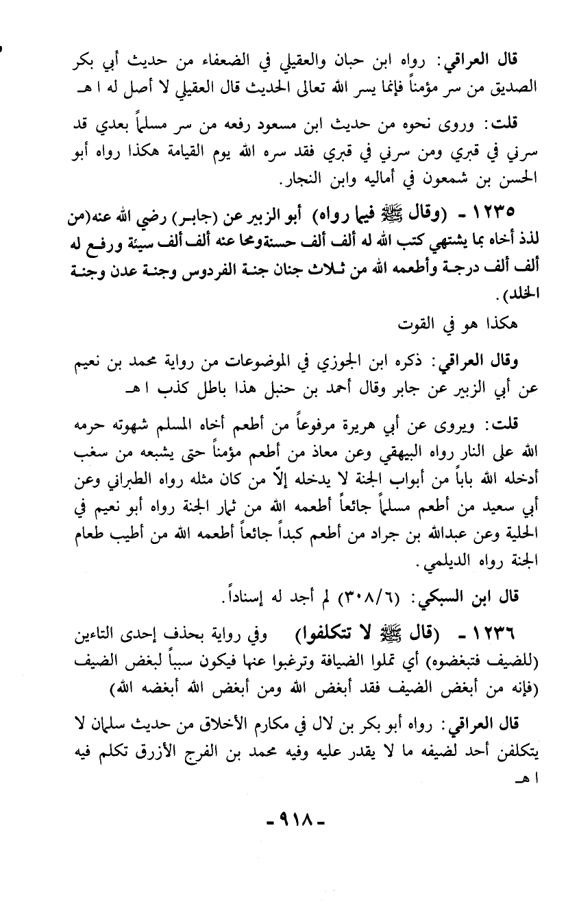 1235 - (وقال - صلّى الله عليه وسلم - فيما رواه) أبو الز بير عن (جابر) رضي الله عنه (من لذذ أخاه بما يشتهي كتب الله له ألف ألف حسنة ومحا عنه ألف ألف سيئة ورفع له ألف ألف درجة وأطعمه الله من ثلاث جنان جنة الفردوس وجنة عدن وجنة الخلد).