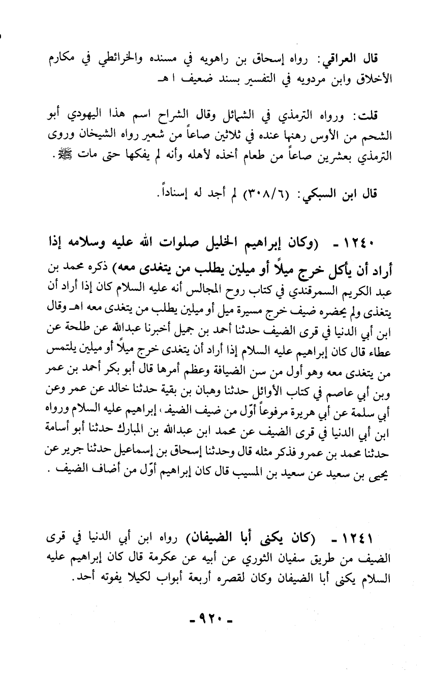 1241 - (كان يكنى أبا الضيفان) رواه ابن أبي الدنيا في قرى الضيف من طريق سفيان الثوري عن أبيه عن عكرمة قال كان إبراهيم عليه السلام يكنى أبا الضيفان وكان لقصره أربعة أبواب لكيلا يفوته أحد.