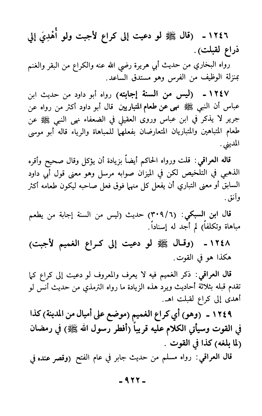 1246 - (قال - صلّى الله عليه وسلم - لو دعيت إلى كراع لأجبت ولو أُهْديَ إلي