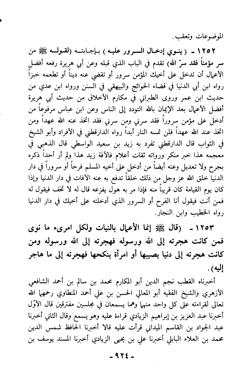 1253 - (قال - صلّى الله عليه وسلم - إنما الأعمال بالنيات ولكل امرئ ما نوى فمن كانت هجرته إلى الله ورسوله فهجرته إلى الله ورسوله ومن كانت هجرته إلى دنيا يصيبها أو امرأة ينكحها فهجرته إلى ما هاجر إليه).