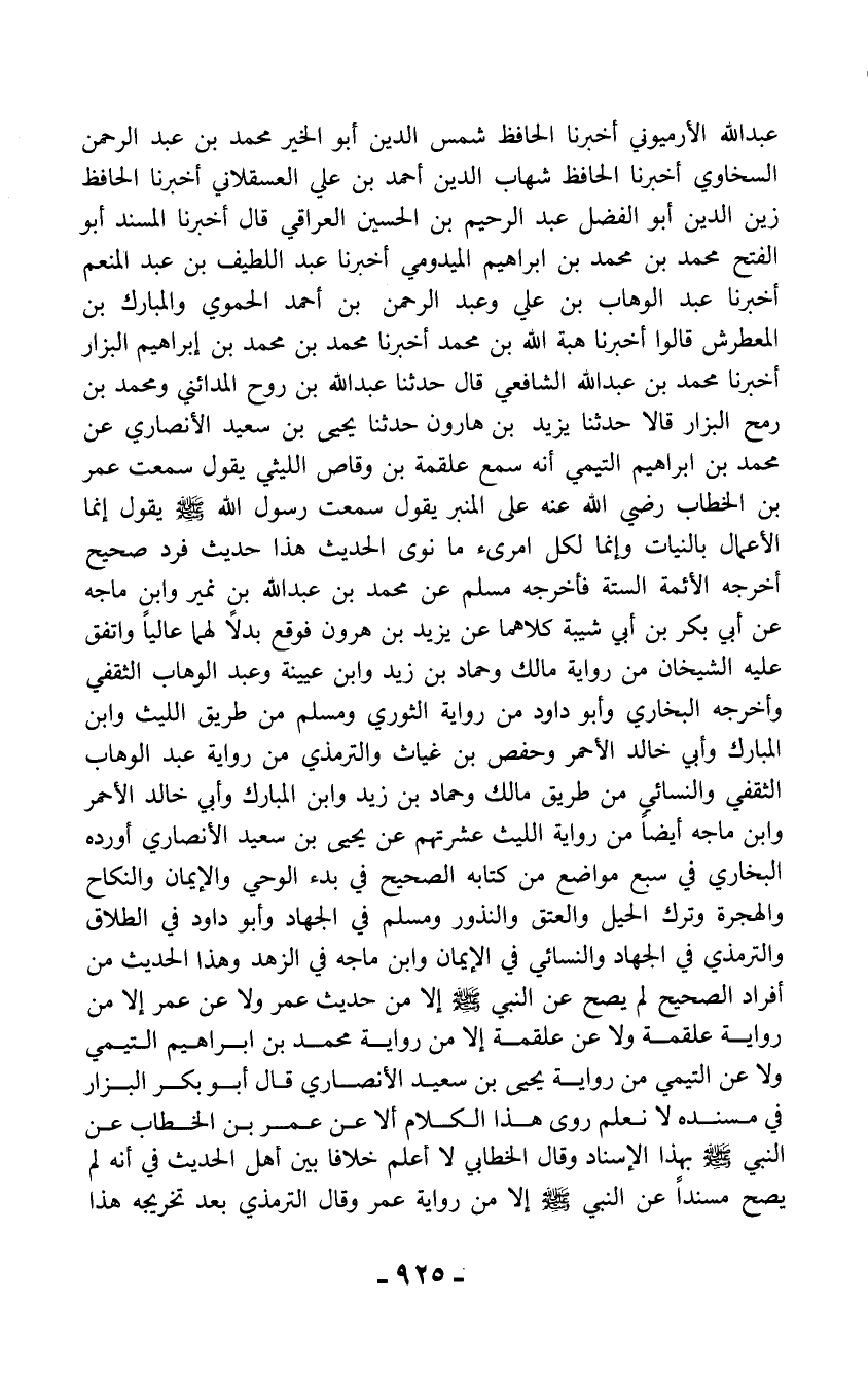 عبد الله الأرميوني أخبرنا الحافظ شمس الدين أبو الخير محمد بن عبد الرحمن السخاوي أخبرنا الحافظ شهاب الدين أحمد بن علي العسقلاني أخبرنا الحافظ زين الدين أبو الفضل عبد الرحيم بن الحسين العراقي قال أخبرنا المسند أبو الفتح محمد بن محمد بن إبراهيم الميدومي أخبرنا عبد اللطيف بن عبد المنعم أخبرنا عبد الوهاب بن علي وعبد الرحمن بن أحمد الحموي والمبارك بن المعطرش قالوا أخبرنا هبة الله بن محمد أخبرنا محمد بن محمد بن إبراهيم البزار أخبرنا محمد بن عبد الله الشافعي قال حدثنا عبد الله بن روح المدائني ومحمد بن رمح البزار قالا حدثنا يزيد بن هارون حدثنا يحيى بن سعيد الأنصاري عن محمد بن إبراهيم التيمي أنه سمع علقمة بن وقاص الليثي يقول سمعت عمر بن الخطاب رضي الله عنه على المنبر يقول سمعت رسول الله - صلّى الله عليه وسلم - يقول إنما الأعمال بالنيات وإنما لكل امرئ ما نوى الحديث هذا حديث فرد صحيح أخرجه الأئمة الستة فأخرجه مسلم عن محمد بن عبد الله بن نمير وابن ماجه عن أبي بكر بن أبي شيبة كلاهما عن يزيد بن هارون فوقع بدلاً لهما عالياً واتفق عليه الشيخان من رواية مالك وحماد بن زيد وابن عيينة وعبد الوهاب الثقفي وأخرجه البخاري وأبو داود من رواية الثوري ومسلم من طريق الليث وابن المبارك وأبي خالد الأحمر وحفص بن غياث والترمذي من رواية عبد الوهاب الثقفي والنسائي من طريق مالك وحماد بن زيد وابن المبارك وأبي خالد الأحمر وابن ماجه أيضاً من رواية الليث عشرتهم عن يحيى بن سعيد الأنصاري أورده البخاري في سبع مواضع من كتابه الصحيح في بدء الوحي والإيمان والنكاح والهجرة وترك الحيل والعتق والنذور ومسلم في الجهاد وأبو داود في الطلاق والترمذي في الجهاد والنسائي في الإيمان وابن ماجه في الزهد وكذا الحديث من أفراد الصحيح لم يصح عن النبي - صلّى الله عليه وسلم - إلا من حديث عمر ولا عن عمر إلا من رواية علقمة ولا عن علقمة إلا من رواية محمد بن إبراهيم التيمي ولا عن التيمي من رواية يحيى بن سعيد الأنصاري قال أبو بكر البزار في مسنده لا نعلم روى هذا الكلام ألا عن عمر بن الخطاب عن النبي - صلّى الله عليه وسلم - بهذا الإسناد وقال الخطابي لا أعلم خلافا بين أهل الحديث في أنه لم يصح مسنداً عن النبي - صلّى الله عليه وسلم - إلا من رواية عمر وقال الترمذي بعد تخريجه هذا