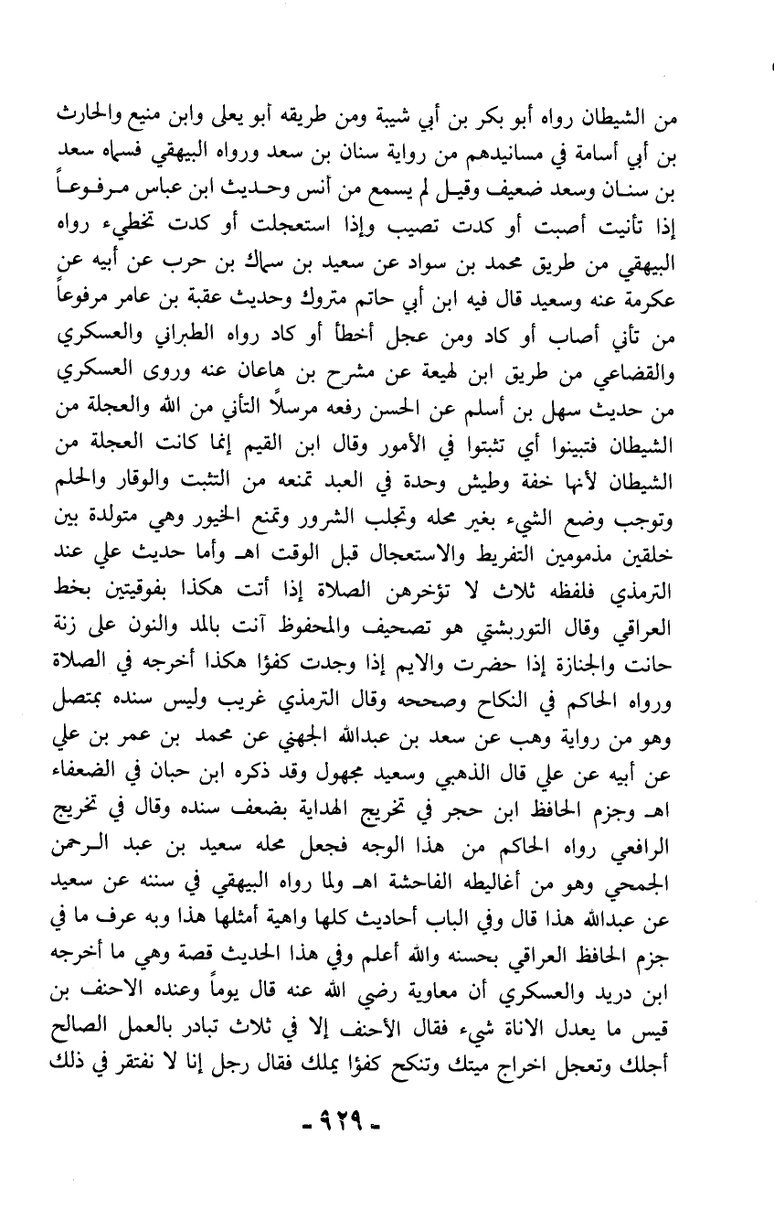 من الشيطان رواه أبو بكر بن أبي شيبة ومن طريقه أبو يعلى وابن منيع والحارث بن أبي أسامة في مسانيدهم من رواية سنان بن سعد ورواه البيهقي فسماه سعد بن سنان وسعد ضعيف وقيل لم يسمع من أنس وحديث ابن عباس مرفوعاً إذا تأنيت أصبت أو كدت تصيب وإذا استعجلت أو كدت تخطئ رواه البيهقي من طريق محمد بن سواد عن سعيد بن سماك بن حرب عن أبيه عن عكرمة عنه وسعيد قال فيه ابن أبي حاتم متروك وحديث عقبة بن عامر مرفوعاً من تأني أصاب أو كاد ومن عجل أخطأ أو كاد رواه الطبراني والعسكري والقضاعي من طريق ابن لهيعة عن مشرح بن هاعان عنه وروى العسكري من حديث سهل بن أسلم عن الحسن رفعه مرسلاً التأني من الله والعجلة من الشيطان فتبينوا أي تثبتوا في الأمور وقال ابن القيم إنما كانت العجلة من الشيطان لأنها خفة وطيش وحدة في العبد تمنعه من التثبت والوقار والحلم وتوجب وضع الشيء بغير محله وتجلب الشرور وتمنع الخيور وهي متولدة بين خلقين مذمومين التفريط والاستعجال قبل الوقت اهـ وأما حديث علي عند الترمذي فلفظه ثلاث لا تؤخرهن الصلاة إذا أتت هكذا بفوقيتين بخط العراقي وقال التوربشتي هو تصحيف والمحفوظ أنت بالمد والنون على زنة حانت والجنازة إذا حضرت والأيم إذا وجدت كفؤا هكذا أخرجه في الصلاة ورواه الحاكم في النكاح وصححه وقال الترمذي غريب وليس سنده بمتصل وهو من رواية وهب عن سعد بن عبد الله الجهني عن محمد بن عمر بن علي عن أبيه عن علي قال الذهبي وسعيد مجهول وقد ذكره ابن حبان في الضعفاء اهـ وجزم الحافظ ابن حجر في تخريج الهداية بضعف سنده وقال في تخريج الرافعي رواه الحاكم من هذا الوجه فجعل محله سعيد بن عبد الرحمن الجمحي وهو من أغاليطه الفاحشة اهـ ولما رواه البيهقي في سننه عن سعيد عن عبد الله هذا قال وفي الباب أحاديث كلها واهية أمثلها هذا وبه عرف ما في جزم الحافظ العراقي بحسنه والله أعلم وفي هذا الحديث قصة وهي ما أخرجه ابن دريد والعسكري أن معاوية رضي الله عنه قال يوماً وعنده الأحنف بن قيس ما يعدل الأناة شيء فقال الأحنف إلا في ثلاث تبادر بالعمل الصالح أجلك وتعجل اخراج ميتك وتنكح كفؤا يملك فقال رجل إنا لا نفتقر في ذلك