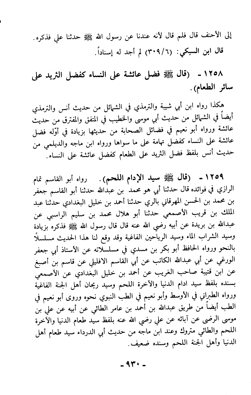 1259 - (قال - صلّى الله عليه وسلم - سيد الإدام اللحم). رواه أبو القاسم تمام الرازي في فوائده قال حدثنا أبي هو محمد بن عبد الله حدثنا أبو القاسم جعفر بن محمد بن الحسن المهرقاني بالري حدثنا أحمد بن خليل البغدادي حدثنا عبد الملك بن قريب الأصمعي حدثنا أبو هلال محمد بن سليم الراسبي عن عبد الله بن بريدة عن أبيه رضي الله عنه قال قال رسول الله - صلّى الله عليه وسلم - فذكره بزيادة وسيد الشراب الماء وسيد الرياحين الفاغية وقد وقع لنا هذا الحديث مسلسلاً بالنحو ورواه الحافظ أبو بكر بن مسدي في مسلسلاته عن الأستاذ أبي جعفر الورغي عن أبي عبد الله الكاتب عن أبي القاسم الإفليلي عن قاسم بن أصبغ عن ابن قتيبة صاحب الغريب عن أحمد بن خليل البغدادي عن الأصمعي بسنده بلفظ سيد أدام الدنيا والآخرة اللحم وسيد ريحان أهل الجنة الفاغية ورواه الطبراني في الأوسط وأبو نعيم في الطب النبوي نحوه وروى أبو نعيم في الطب أيضاً من طريق عبد الله بن أحمد بن عامر الطائي عن أبيه عن علي بن موسى الرضي عن آبائه عن علي رضي الله عنه بلفظ سيد طعام الدنيا والآخرة اللحم والطائي متروك وعند ابن ماجه من حديث أبي الدرداء سيد طعام أهل الدنيا وأهل الجنة اللحم وسنده ضعيف.