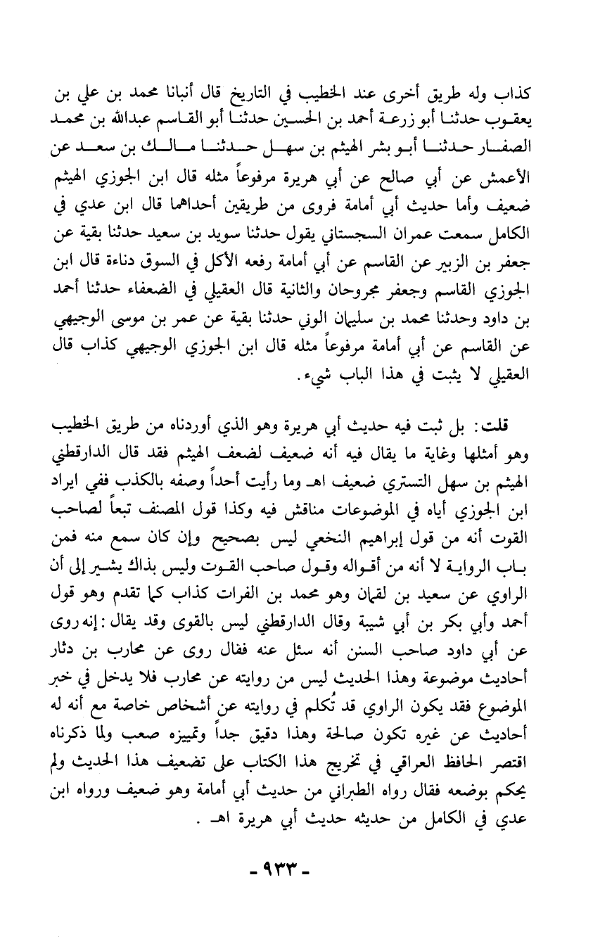 قلت: بل ثبت فيه حديث أبي هريرة وهو الذي أوردناه من طريق الخطيب وهو أمثلها وغاية ما يقال فيه أنه ضعيف لضعف الهيثم فقد قال الدارقطني الهيثم بن سهل التستري ضعيف اهـ وما رأيت أحداً وصفه بالكذب ففي إيراد ابن الجوزي أياه في الموضوعات مناقش فيه وكذا قول المصنف تبعاً لصاحب القوت أنه من قول إبراهيم النخعي ليس بصحيح وإن كان سمع منه فمن باب الرواية لا أنه من أقواله وقول صاحب القوت وليس بذاك يشير إلى أن الراوي عن سعيد بن لقمان وهو محمد بن الفرات كذاب كما تقدم وهو قول أحمد وأبي بكر بن أبي شيبة وقال الدارقطني ليس بالقوى وقد يقال: إنه روى عن أبي داود صاحب السنن أنه سئل عنه فقال روى عن محارب بن دثار أحاديث موضوعة وهذا الحديث ليس من روايته عن محارب فلا يدخل في خبر الموضوع فقد يكون الراوي قد تُكلم في روايته عن أشخاص خاصة مع أنه له أحاديث عن غيره تكون صالحة وهذا دقيق جداً وتمييزه صعب ولما ذكرناه اقتصر الحافظ العراقي في تخريج هذا الكتاب على تضعيف هذا الحديث ولم يحكم بوضعه فقال رواه الطبراني من حديث أبي أمامة وهو ضعيف ورواه ابن عدي في الكامل من حديثه حديث أبي هريرة اهـ.