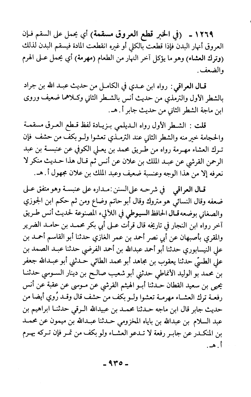 1269 - (في الخبر قطع العروق مسقمة) أي يحمل على السقم فإن العروق أنهار البدن فإذا قطعت بالكلي أو غيره انقطعت المادة فيسقم البدن لذلك (وترك العشاء) وهو ما يؤكل آخر النهار من الطعام (مهرمة) أي يحمل على الهرم والضعف.