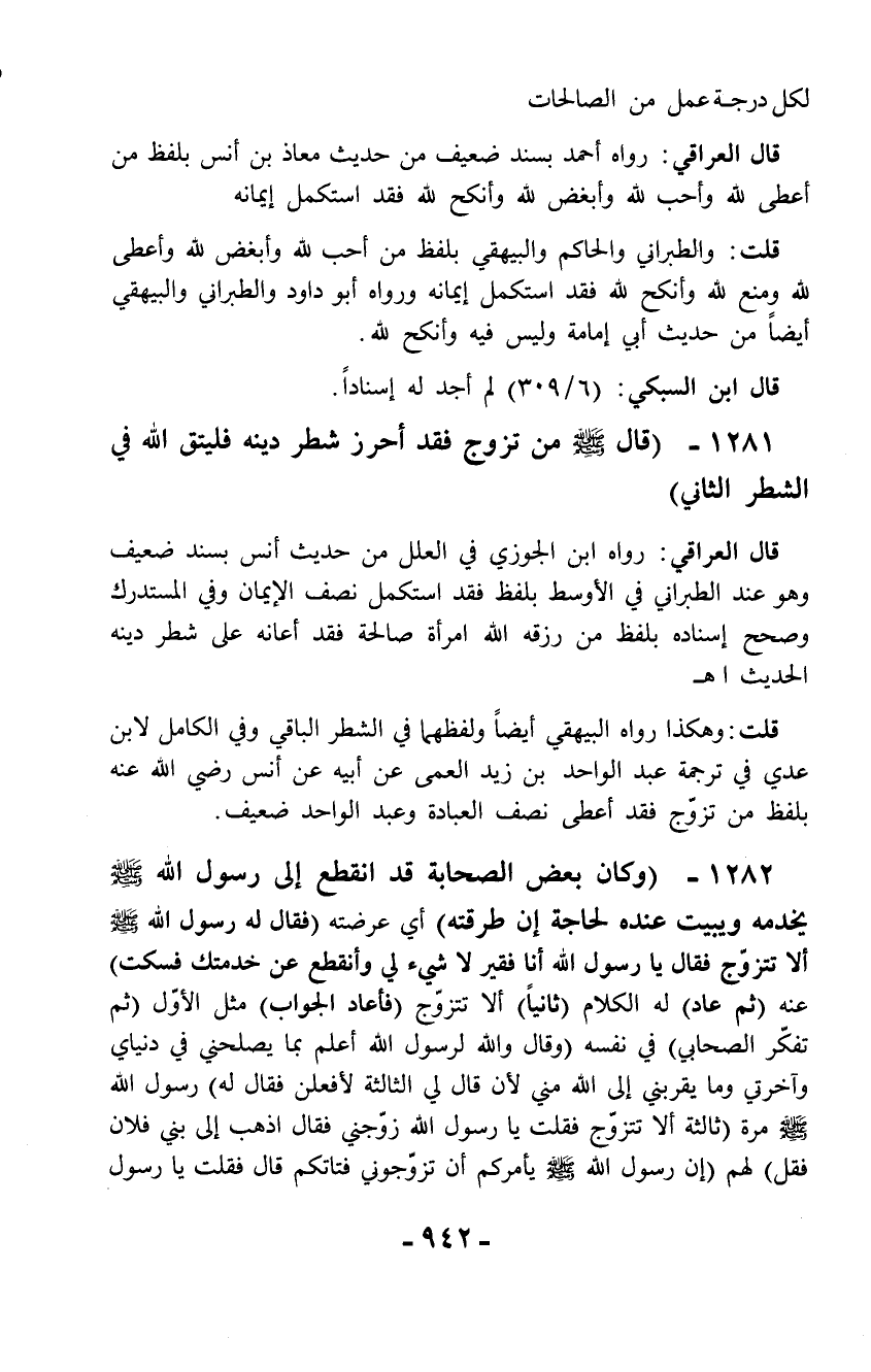 قلت: وهكذا رواه البيهقي أيضاً ولفظهما في الشطر الباقي وفي الكامل لابن عدي في ترجمة عبد الواحد بن زيد العمى عن أبيه عن أنس رضي الله عنه بلفظ من تزوّج فقد أعطى نصف العبادة وعبد الواحد ضعيف.