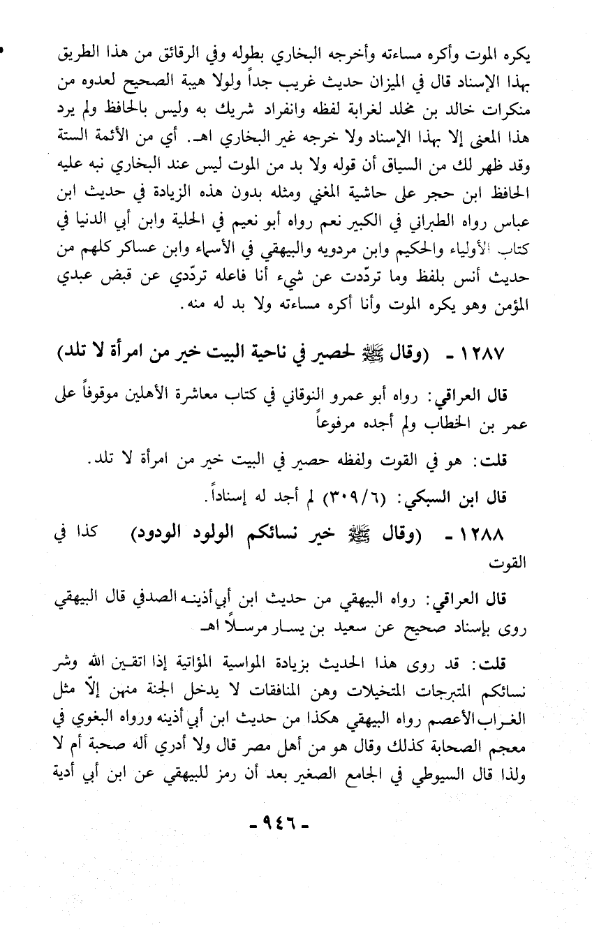 1287 - (وقال - صلّى الله عليه وسلم - لحصير في ناحية البيت خير من امرأة لا تلد)