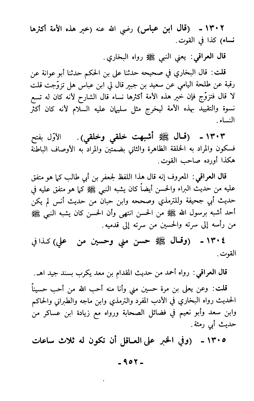 1304 - (وقال - صلّى الله عليه وسلم - حسن مني وحسين من علي) كذا في القوت.