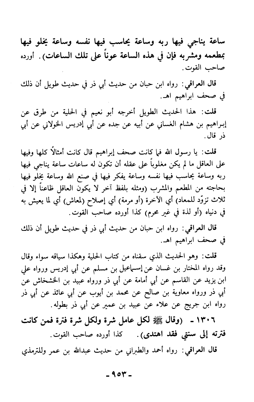 1306 - (وقال - صلّى الله عليه وسلم - لكل عامل شرة ولكل شرة فترة فمن كانت فترته إلى سنتي فقد اهتدى). كذا أورده صاحب القوت.