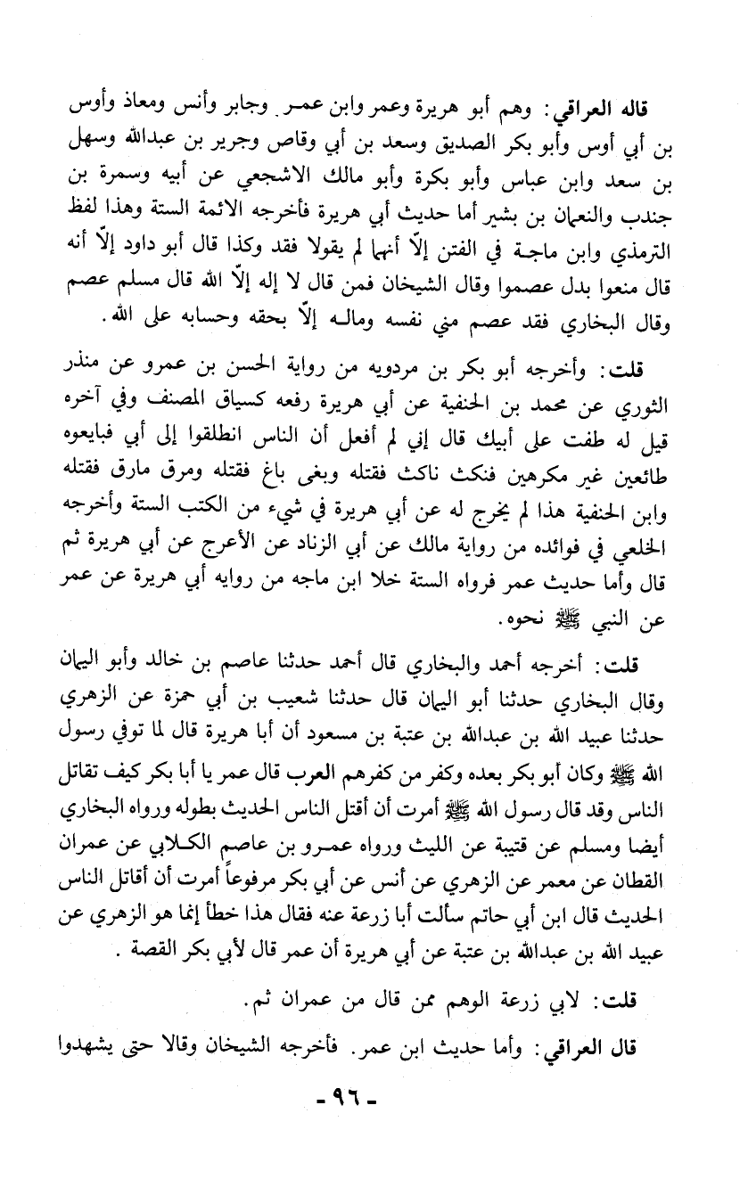 قاله العراقي: وهم أبو هريرة وعمر وابن عمر وجابر وأنس ومعاذ وأوس بن أبي أوس وأبو بكر الصديق وسعد بن أبي وقاص وجرير بن عبد الله وسهل بن سعد وابن عباس وأبو بكرة وأبو مالك الأشجعي عن أبيه وسمرة بن جندب والنعمان بن بشير أما حديث أبي هريرة فأخرجه الأئمة الستة وهذا لفظ الترمذي وابن ماجة في الفتن إلاَّ أنهما لم يقولا فقد وكذا قال أبو داود إلاَّ أنه قال منعوا بدل عصموا وقال الشيخان فمن قال لا إله إلاَّ الله قال مسلم عصم وقال البخاري فقد عصم مني نفسه وماله إلاَّ بحقه وحسابه على الله.