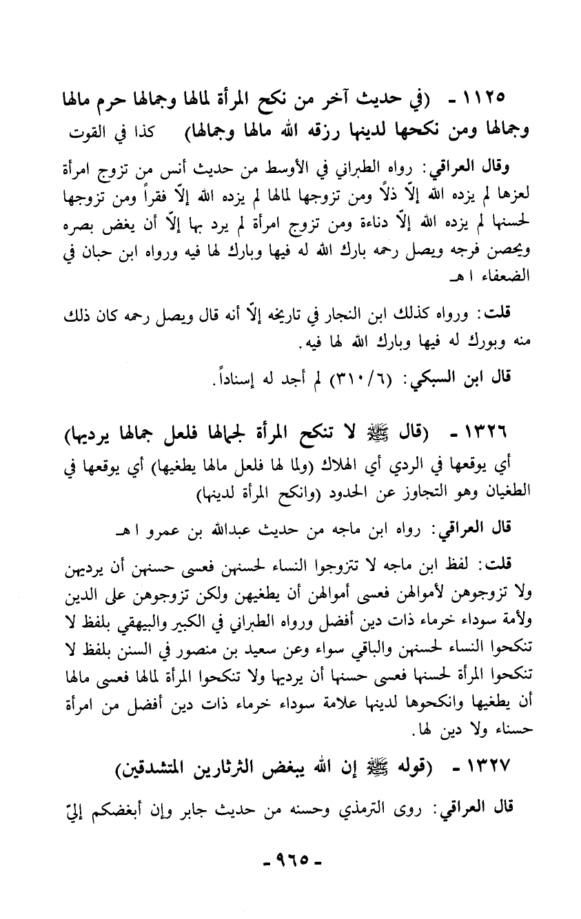 1125 - (في حديث آخر من نكح المرأة لمالها وجمالها حرم مالها وجمالها ومن نكحها لدينها رزقه الله مالها وجمالها) كذا في القوت