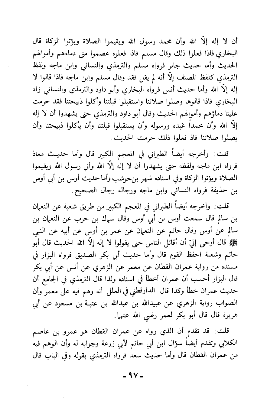 قلت: وأخرجه أيضاً الطبراني في المعجم الكبير من طريق شعبة عن النعمان بن سالم قال سمعت أوس بن أبي أوس وقال سماك بن حرب عن النعمان بن سالم عن أوس وقال حاتم عن النعمان عن عمر بن أوس عن أبيه عن النبي - صلى الله عليه وسلم - قال أوحى إليّ أن أقاتل الناس حتى يقولوا لا إله إلاَّ الله الحديث قال أبو حاتم وشعبة احفظ القوم قال وأما حديث أبي بكر الصديق فرواه البزار في مسنده من رواية عمران القطان عن معمر عن الزهري عن أنس عن أبي بكر قال البزار أحسب أن عمران أخطأ في إسناده ولذا قال الترمذي في الجامع أن حديث عمران خطأ وكذا قال الدارقطني في العلل أنه وهم فيه على معمر وأن الصواب رواية الزهري عن عبيد الله بن عبد الله بن عتبة بن مسعود عن أبي هريرة قال قال أبو بكر لعمر رضي الله عنهما.