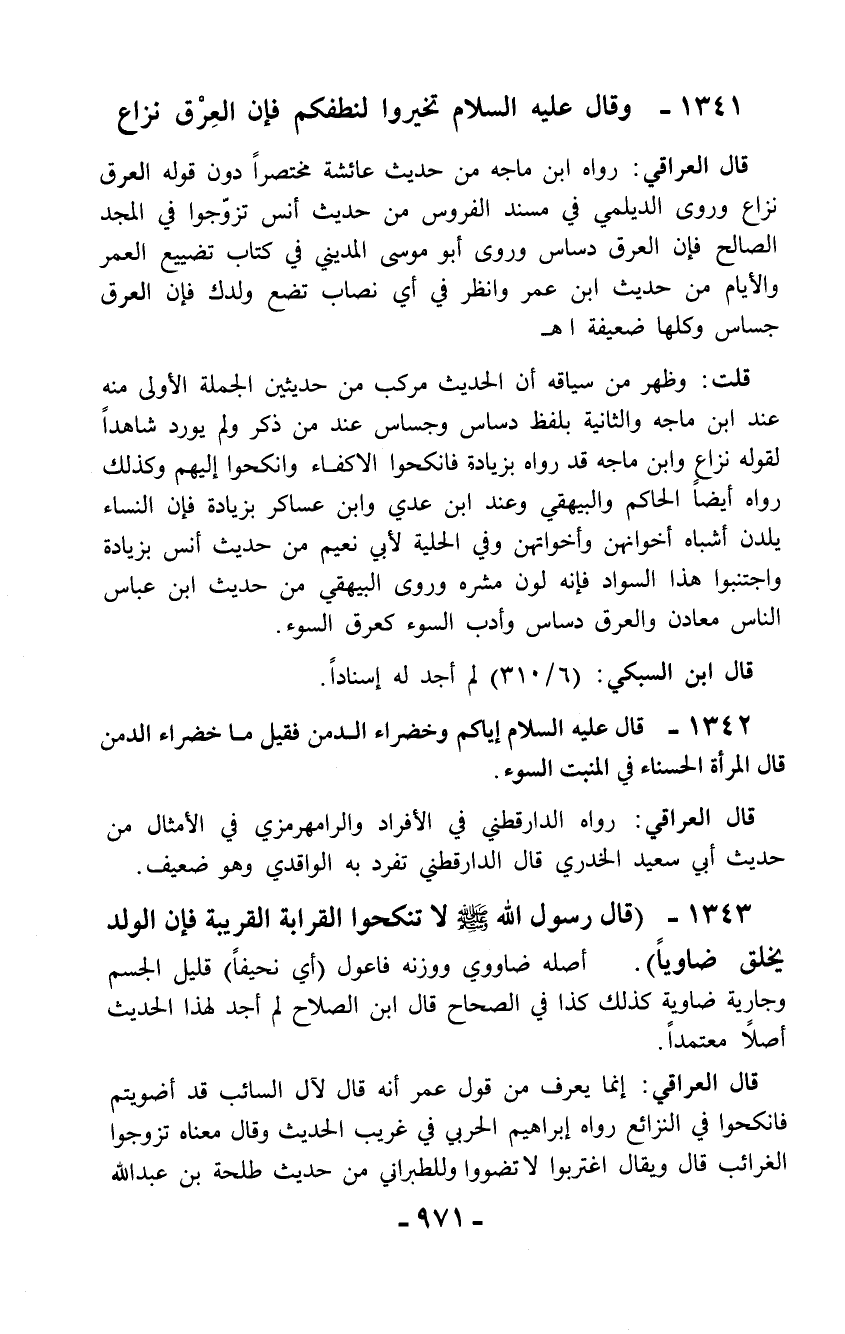 1343 - (قال رسول الله - صلّى الله عليه وسلم - لا تنكحوا القرابة القريبة فإن الولد يخلق ضاوياً). أصله ضاووي ووزنه فاعول (أي نحيفاً) قليل الجسم وجارية ضاوية كذلك كذا في الصحاح قال ابن الصلاح لم أجد لهذا الحديث أصلاً معتمداً.
