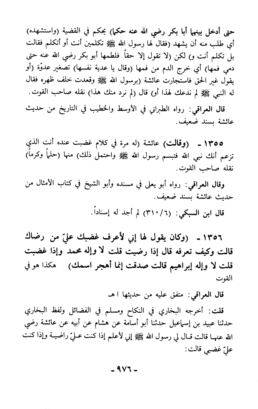 1355 - (وقالت) عائشة (له مرة في كلام غضبت عنده أنت الذي تزعم أنك نبي الله فتبسم رسول الله - صلّى الله عليه وسلم - واحتمل ذلك) منها (حلماً وكرماً) نقله صاحب القوت.